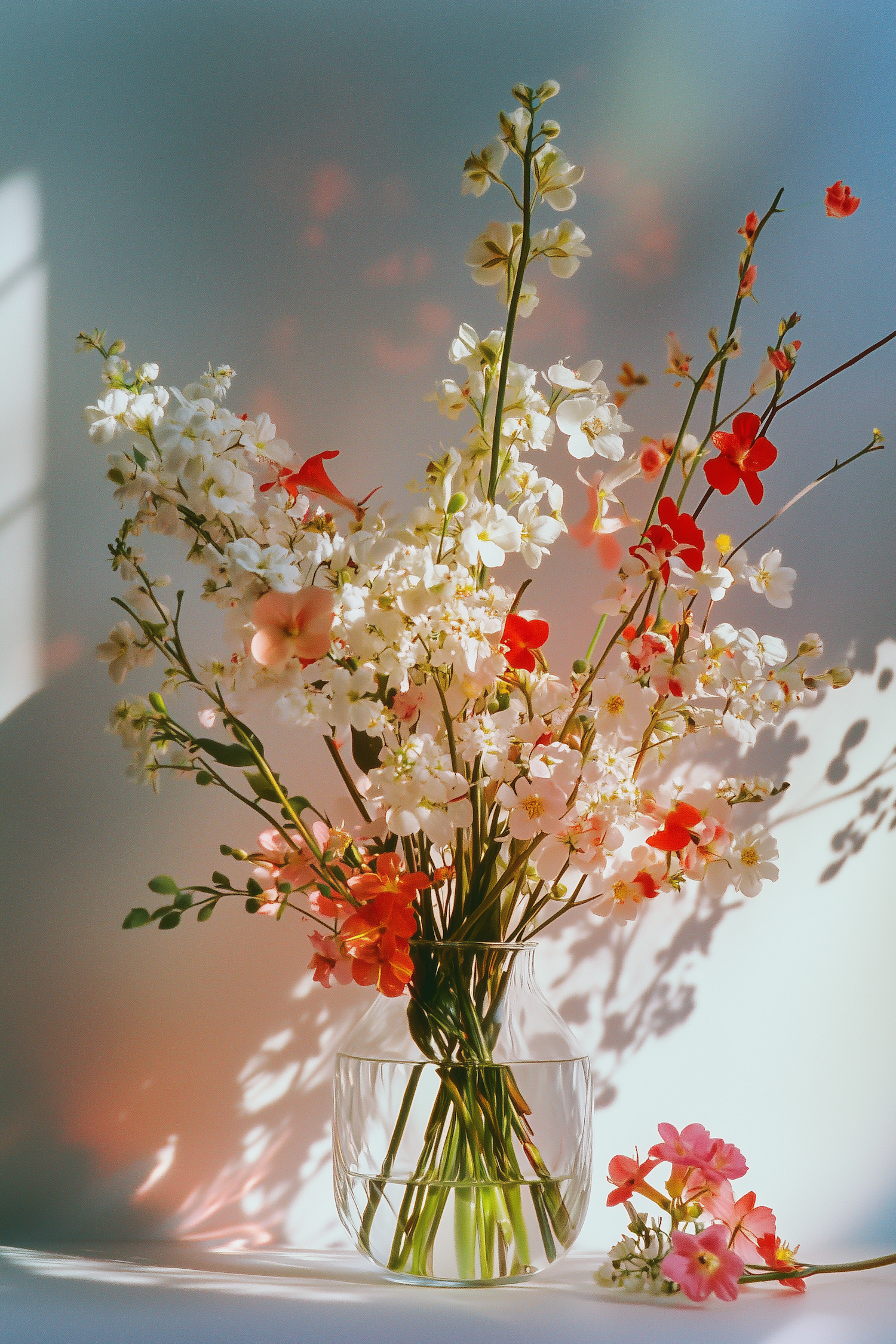 A glass vase with white, pink, and red flowers in soft sunlight, casting delicate shadows on a white surface. Perfect for a serene vibe.