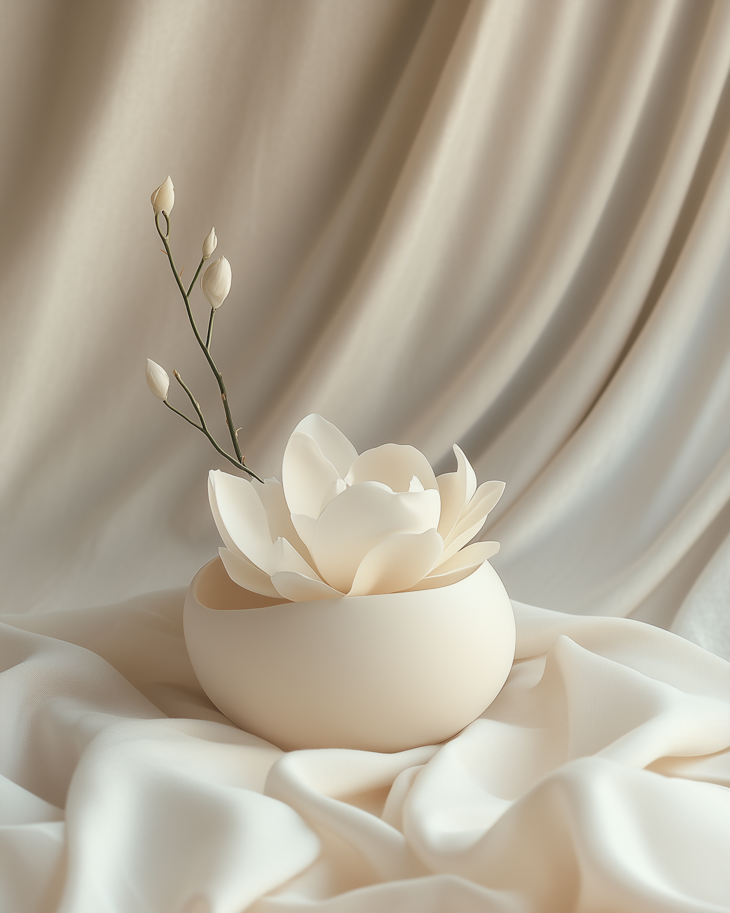 Minimalist white ceramic bowl with a sculptural flower and buds, set against flowing beige fabric for a serene, elegant aesthetic.