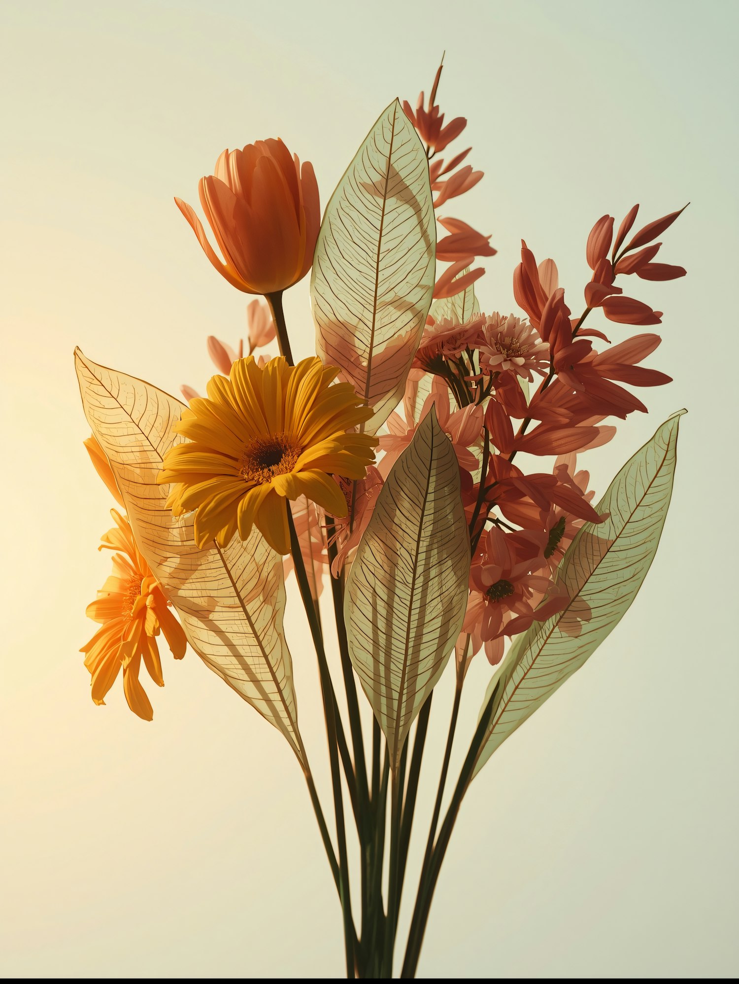 A vibrant bouquet of yellow and orange flowers with translucent leaves, beautifully lit against a soft gradient background.