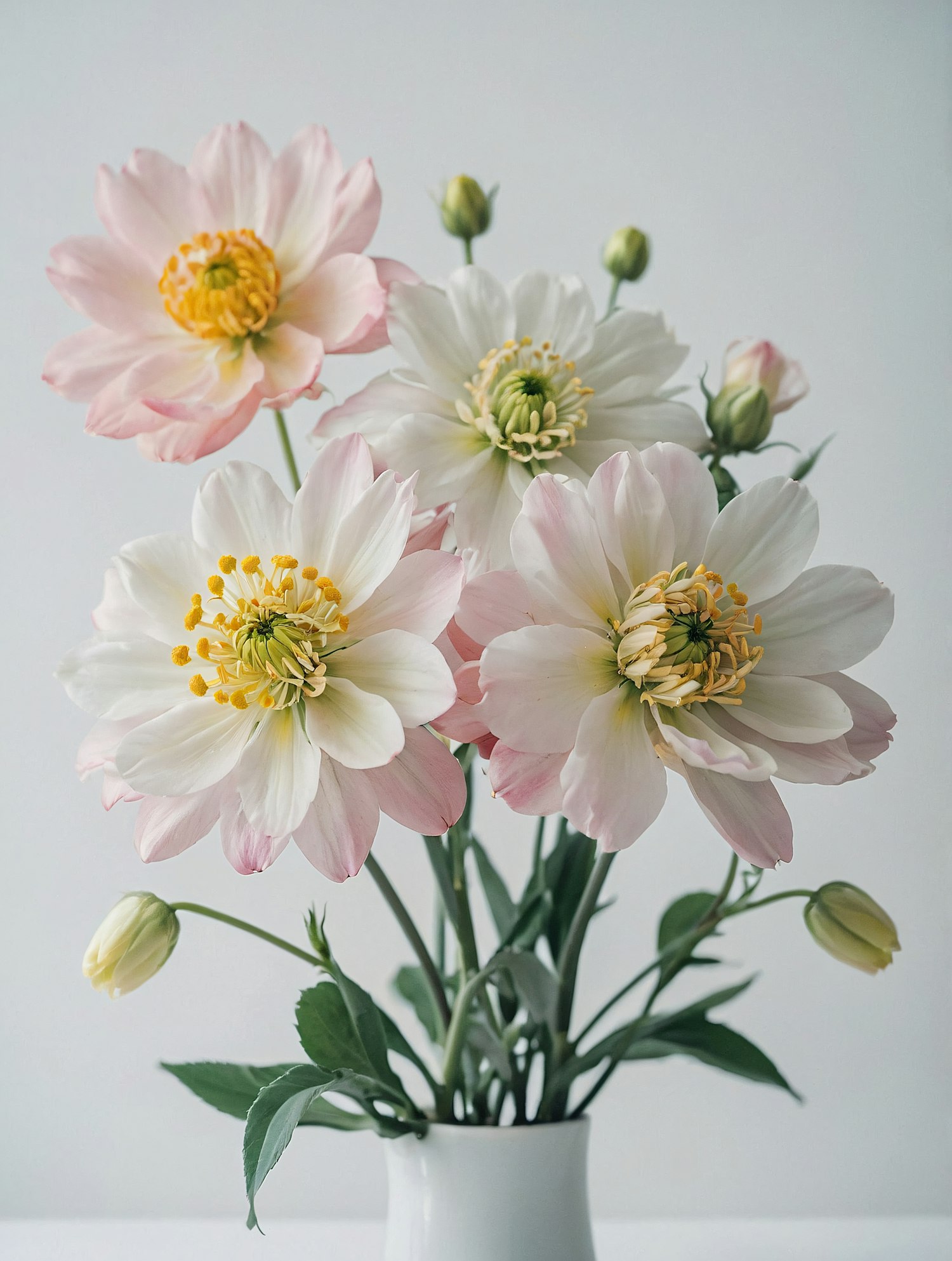 Elegant pink and white flowers with yellow centers in a white vase, surrounded by green leaves and buds, on a soft minimal background.