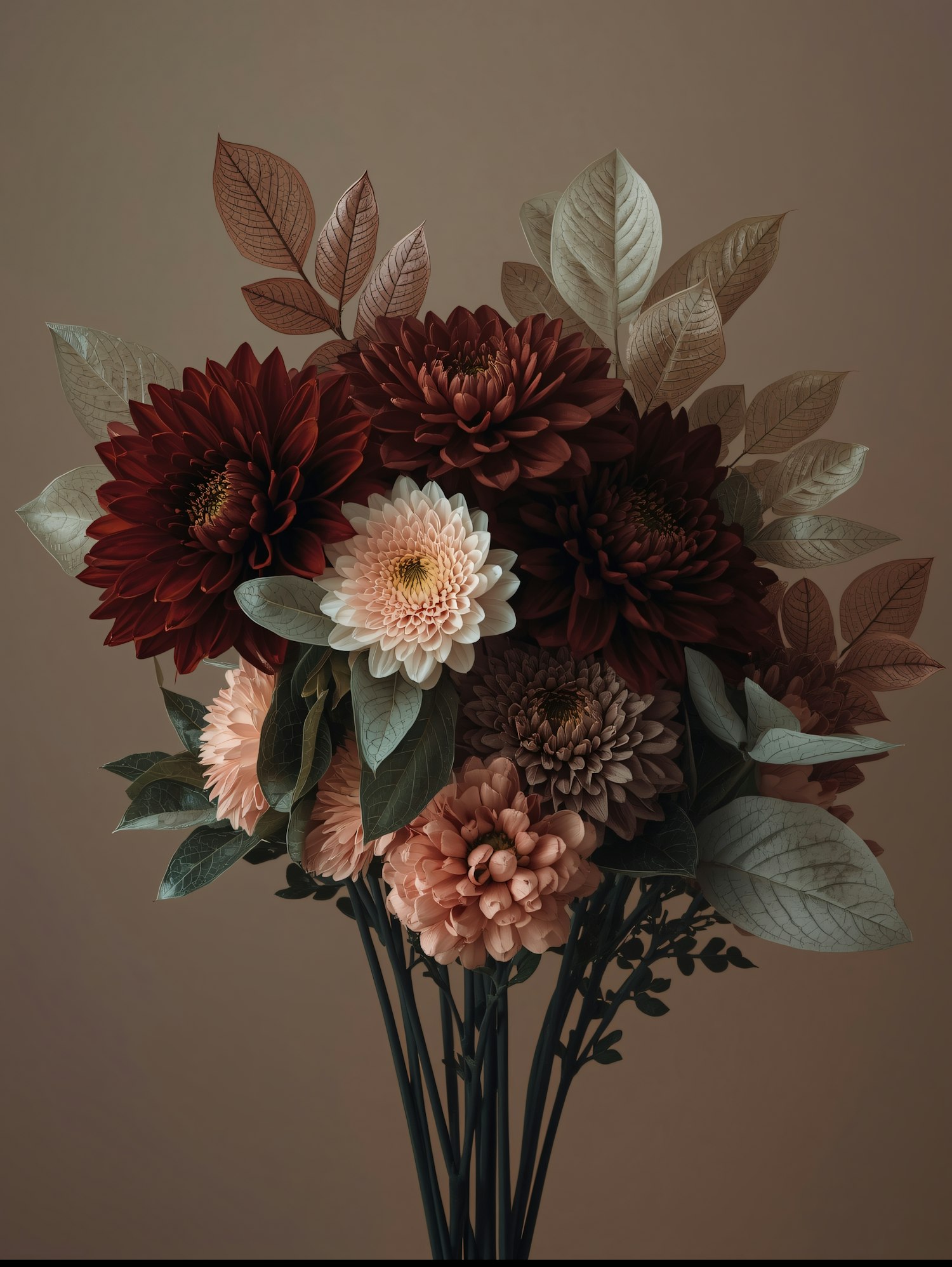A stunning bouquet of red, pink, and white flowers with green and beige leaves, beautifully arranged against a soft neutral backdrop.
