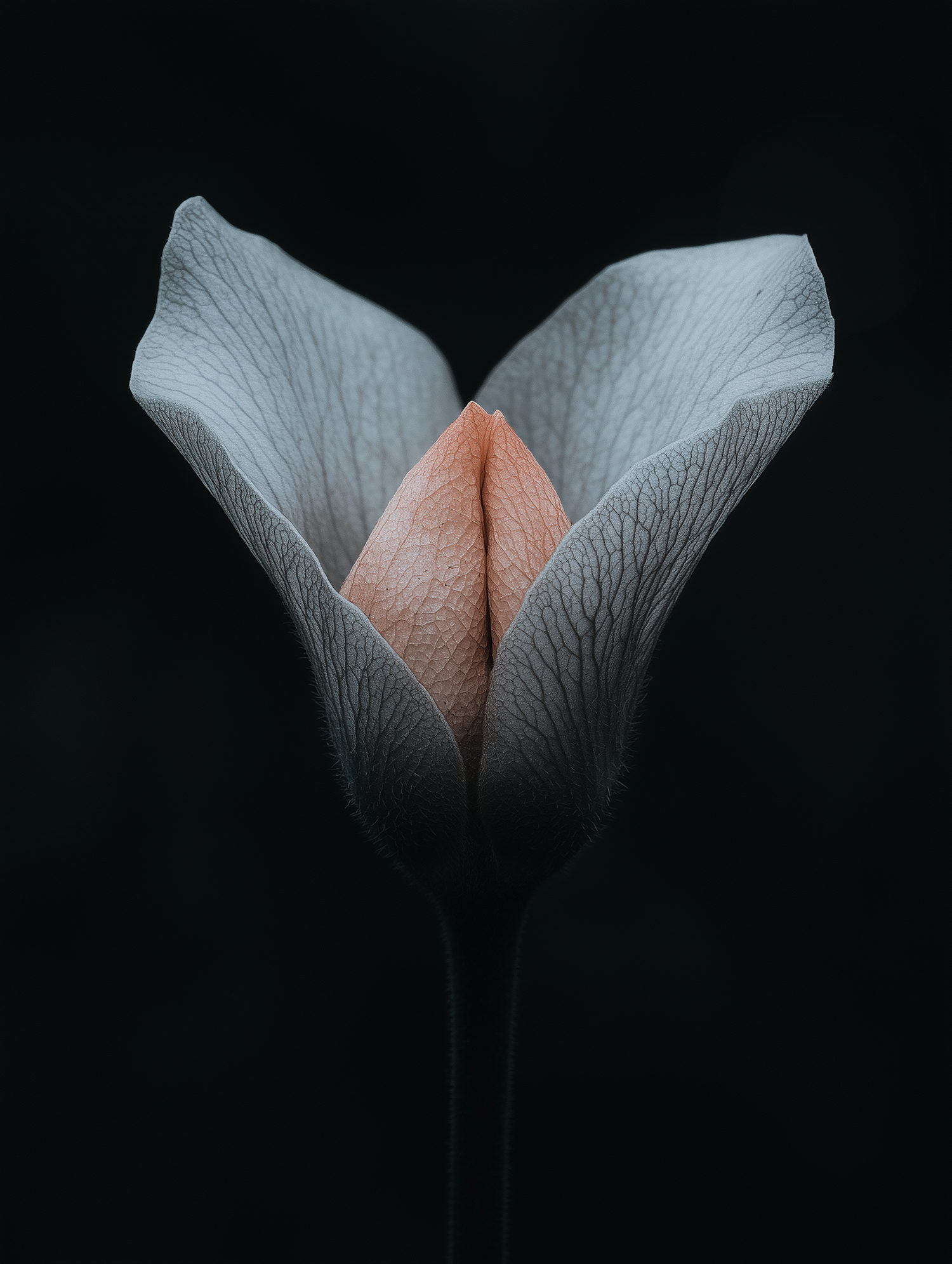 Close-up of a flower with pale blue petals and a peach center against a dark background, highlighting its delicate texture and symmetry.