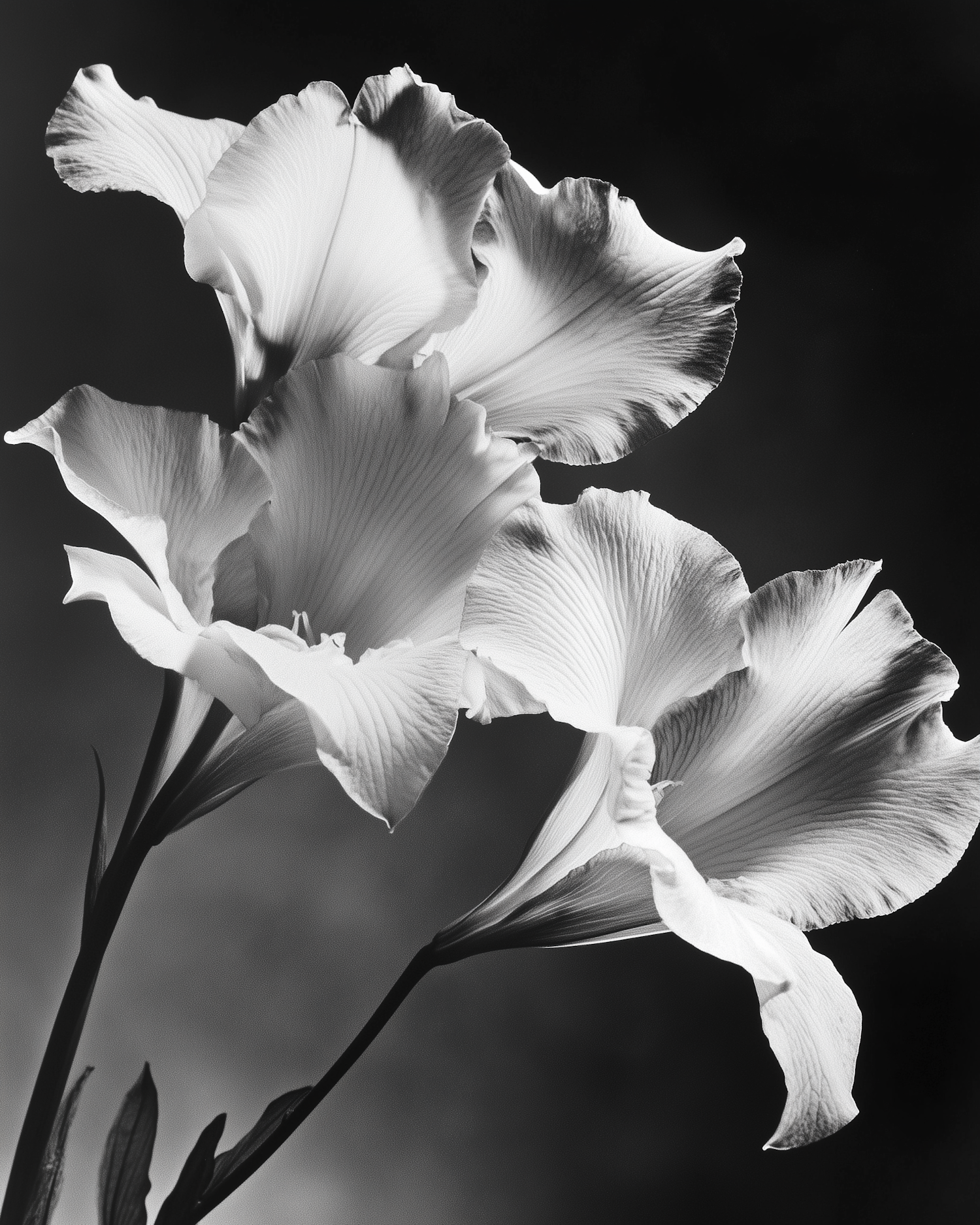 Black-and-white close-up of delicate flowers with flowing petals, set against a dark background for a timeless, artistic feel.