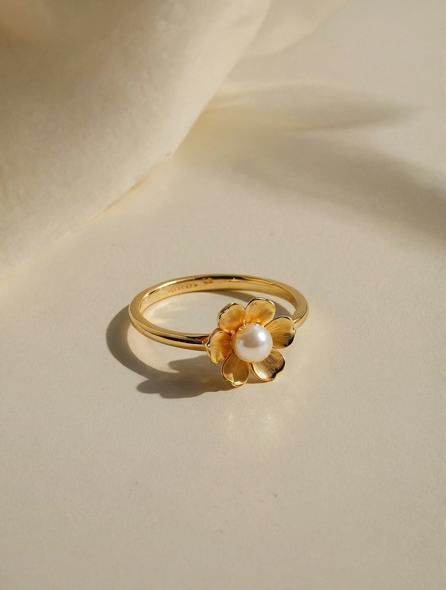 Elegant gold ring with a flower design and a pearl centerpiece, set against a soft cream background with warm, natural lighting.