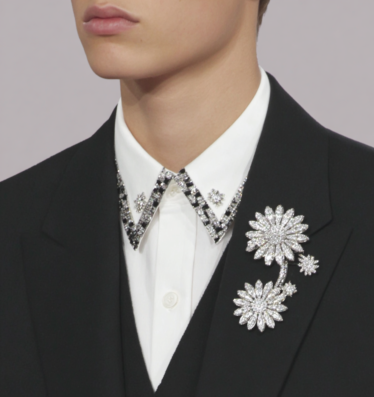 Close-up of a formal suit with a jeweled collar and a sparkling floral brooch, showcasing intricate design and elegance.