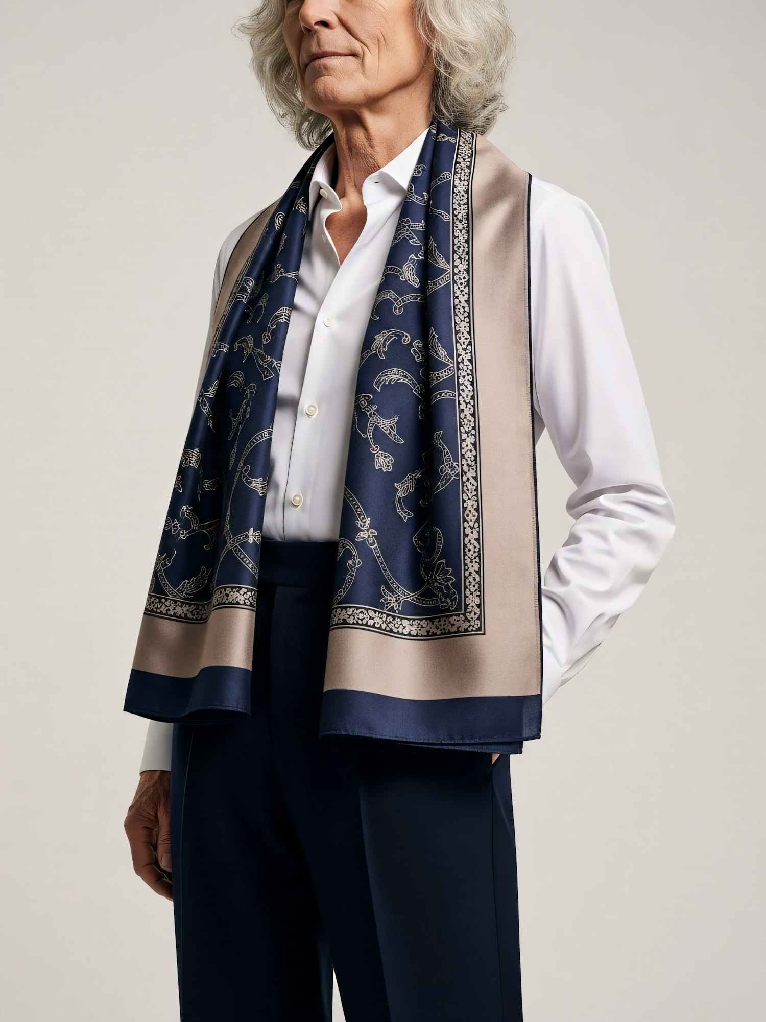 A person in formal attire with a patterned scarf, showcasing elegance and style against a neutral background.