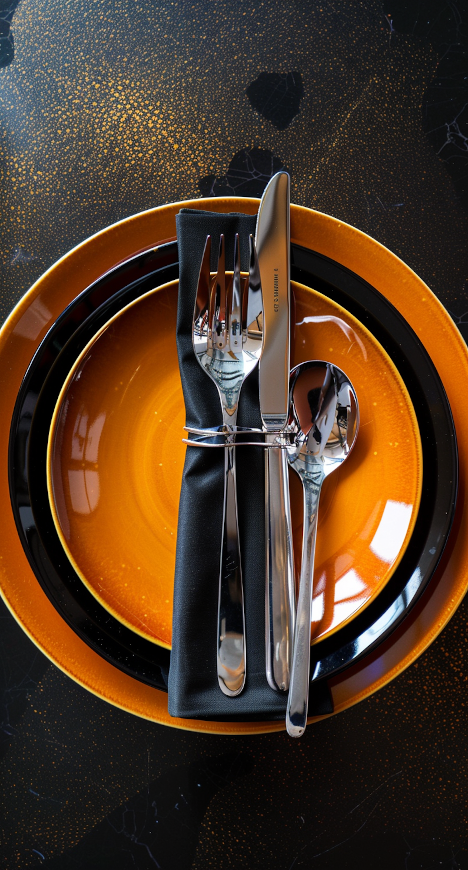 Elegant table setting with orange and black plates, black napkin, and polished silverware on a speckled dark surface.