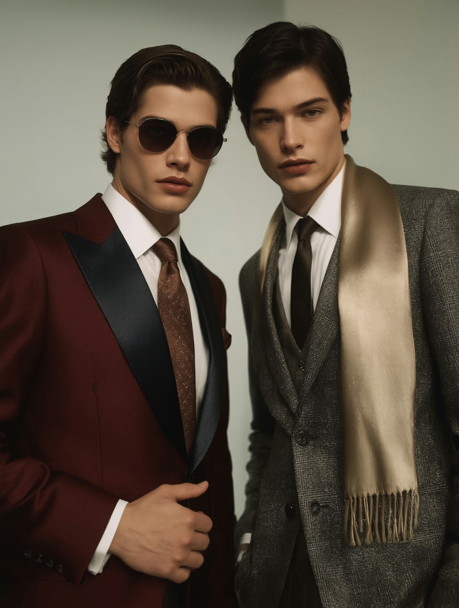 Two stylish men in formal suits, one in burgundy with sunglasses, the other in gray with a gold scarf, posing against a neutral background.