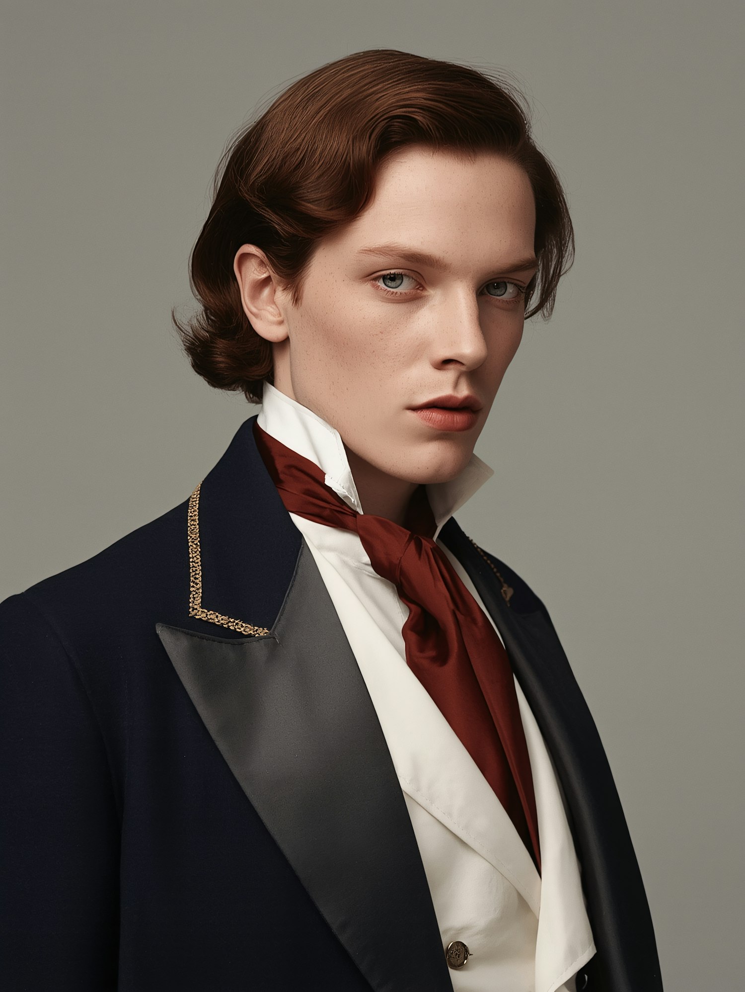 A person in formal attire with a navy jacket, white shirt, and red cravat, set against a neutral background.