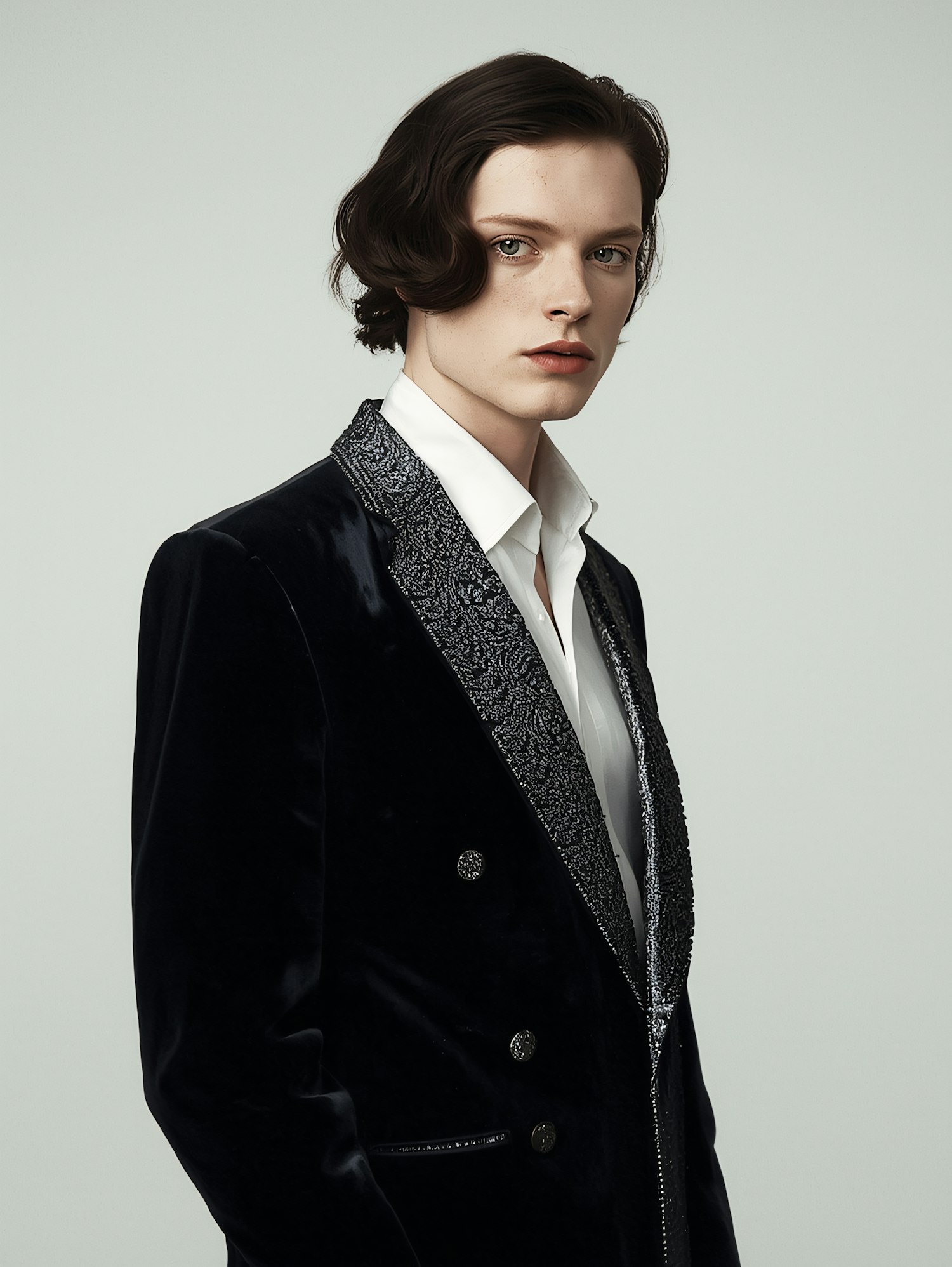 A person in a dark velvet blazer with detailed lapels and a white shirt, posing against a neutral background.
