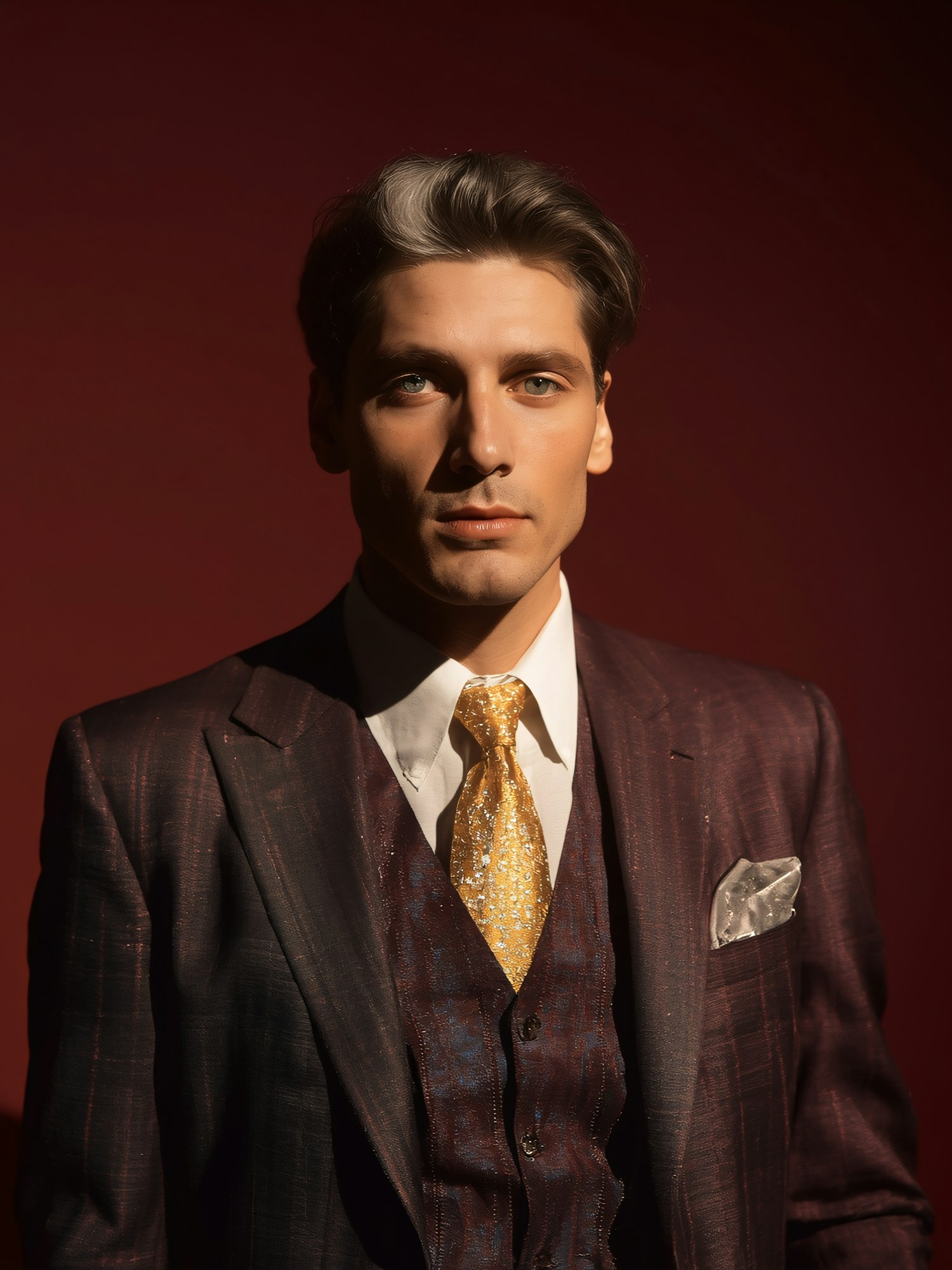 A man in a burgundy suit with a golden tie stands against a red background, exuding elegance and sophistication.
