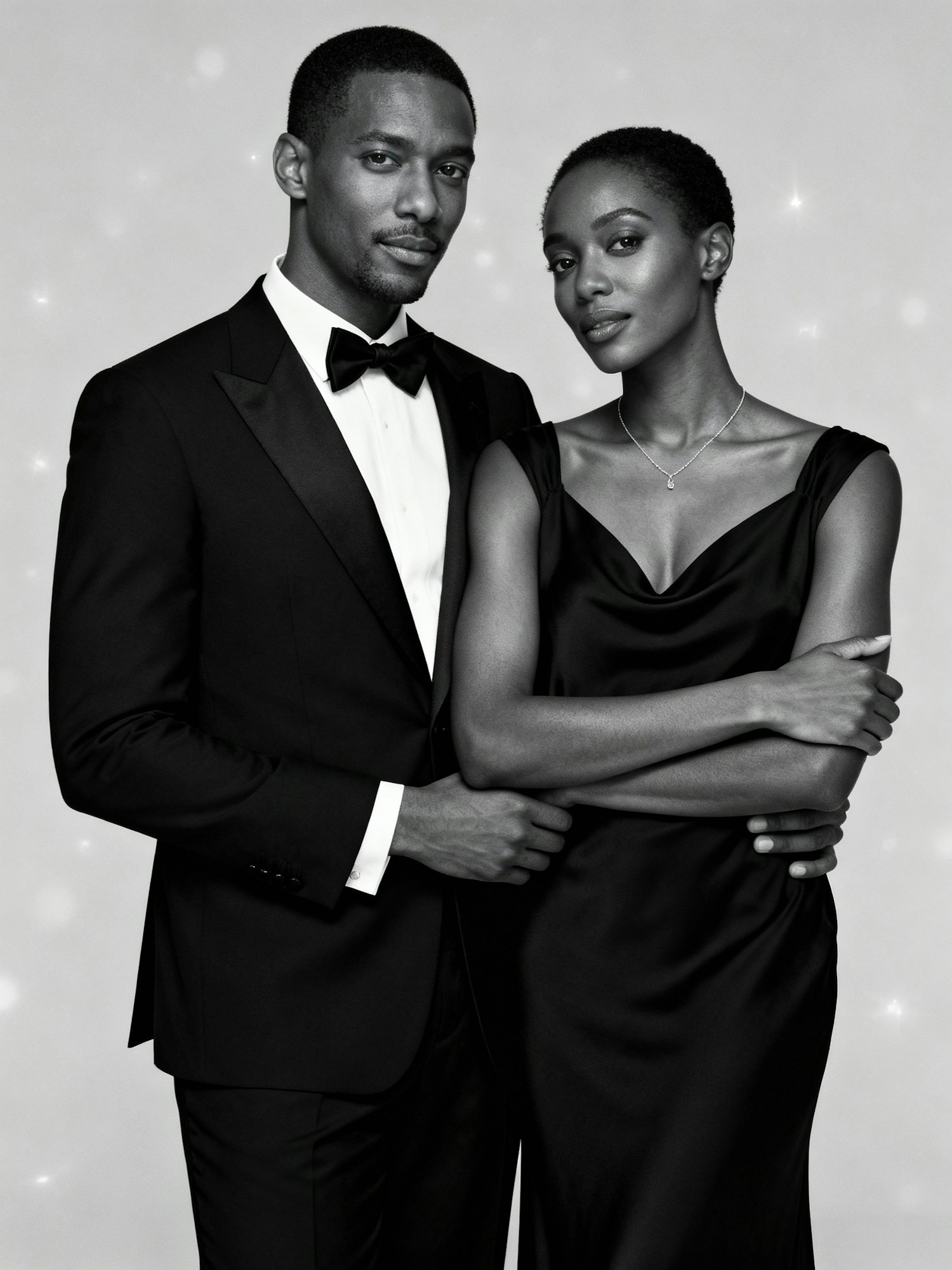A close-up editorial portrait of two stylish Black individuals posing together in a minimalist studio setting. One wears a classic black tuxedo with a crisp white shirt and black bow tie, while the other dons a long, elegant black dress paired with a delicate necklace. They stand side by side, arms gently wrapped around each other’s waists, radiating warmth and sophistication. Their glowing, hyperrealistic skin contrasts beautifully with the tailored silhouettes and formal styling. The plain background is a soft, luminous pearl gray — chosen to subtly complement both their skin tones and the refined black-and-white palette. Lighting is soft and balanced, enhancing intimacy, elegance, and editorial grace.