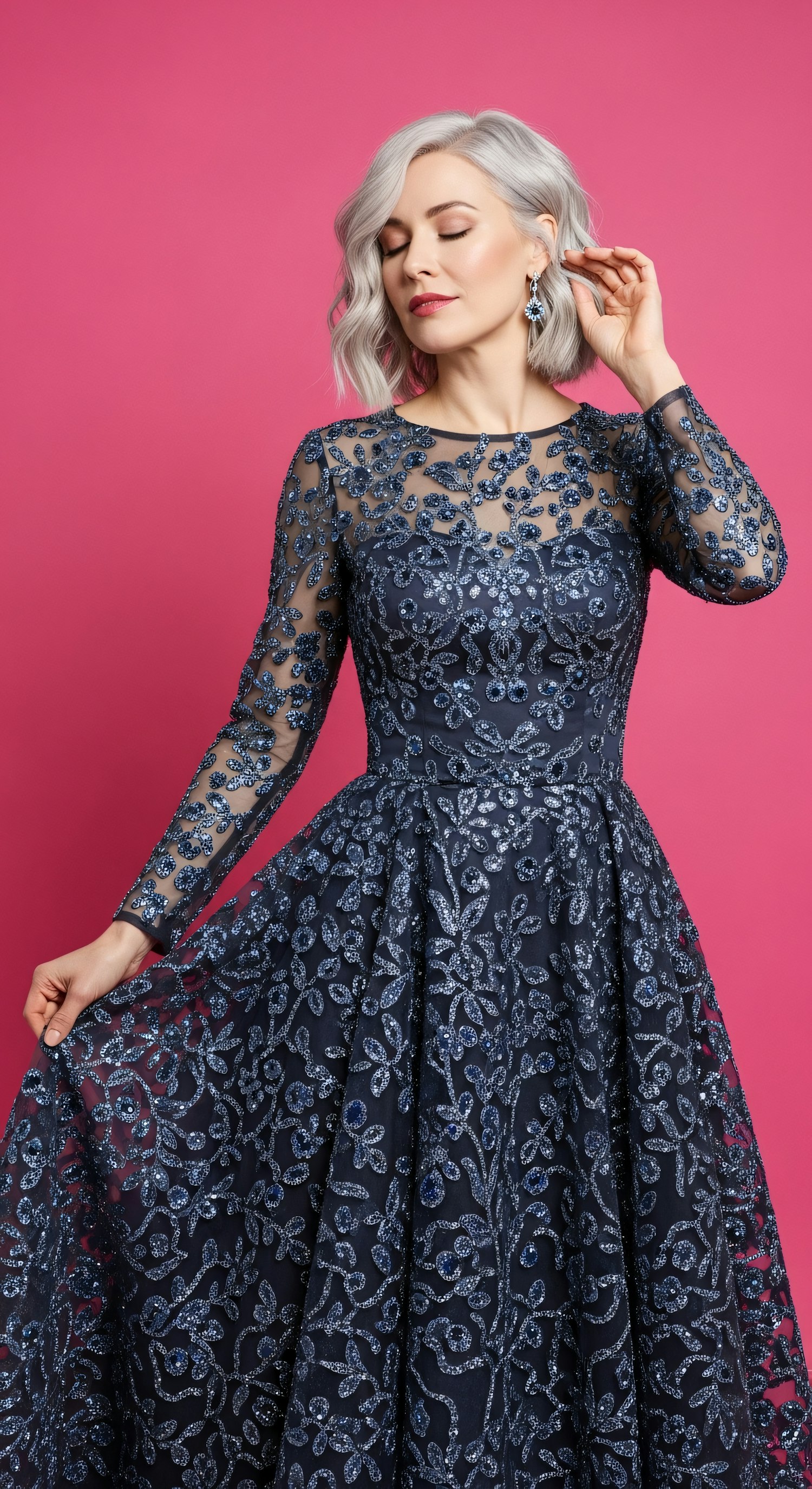 Elegant woman in a shimmering blue embroidered gown against a pink background, exuding grace and style.