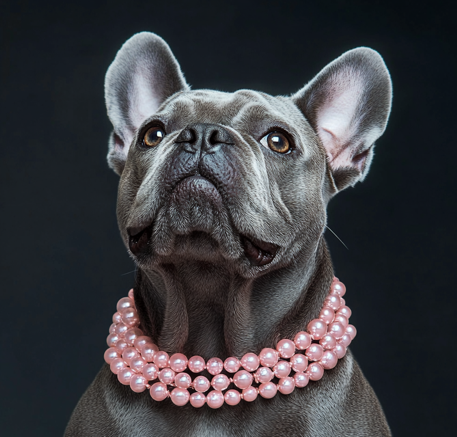 Elegant French Bulldog wearing a pink pearl necklace, gazing upward with a dignified expression against a dark background.