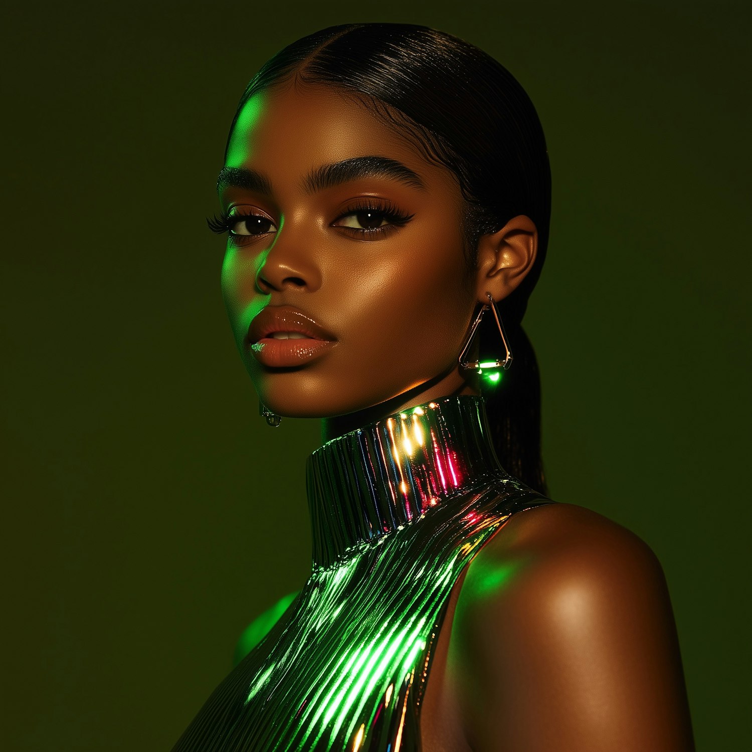 A stunning portrait of a woman in a reflective metallic top, glowing with green and rainbow hues, set against a rich green background.