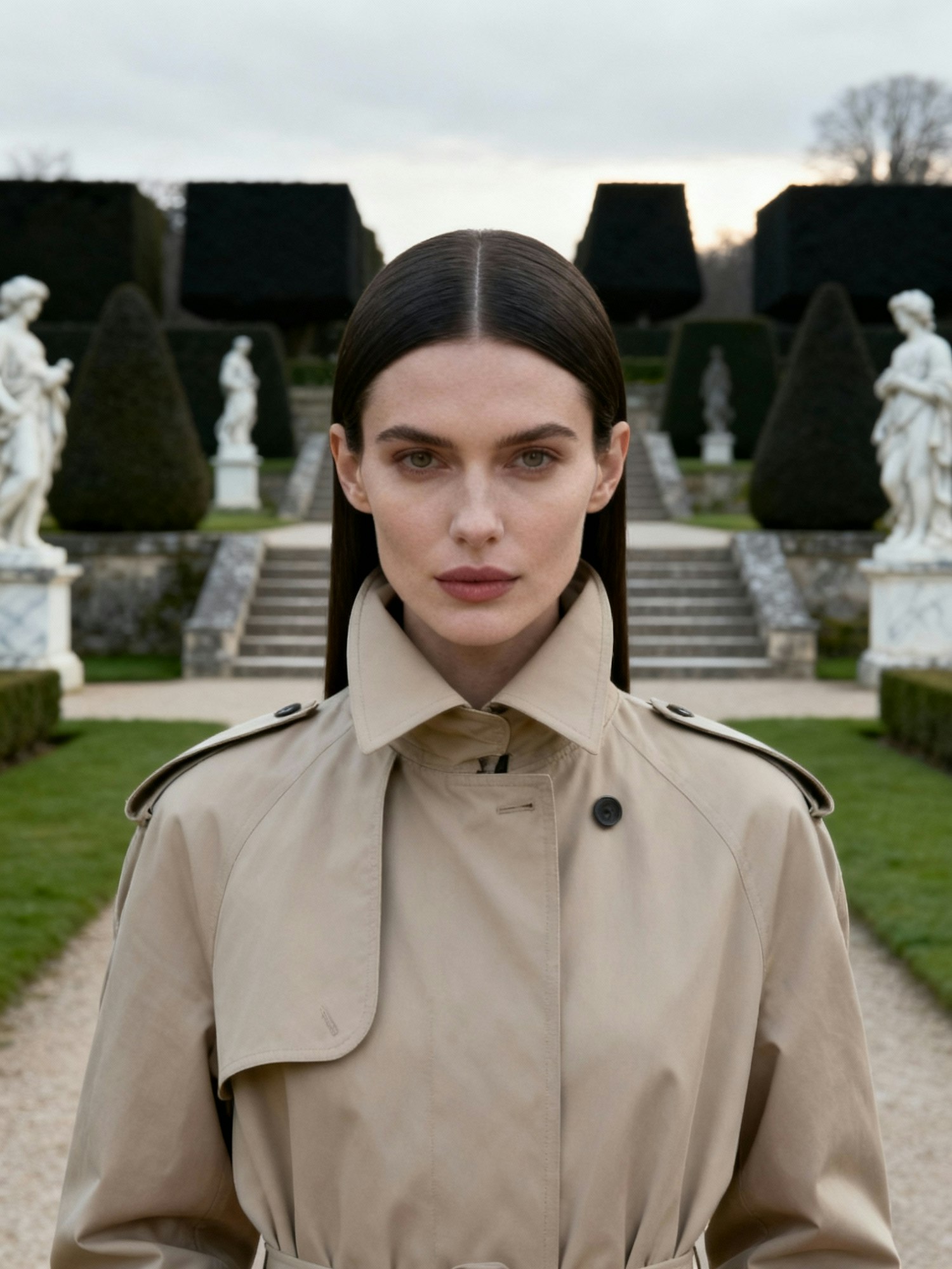 A woman in a beige trench coat stands in a formal garden with statues and trimmed hedges, exuding elegance and symmetry.