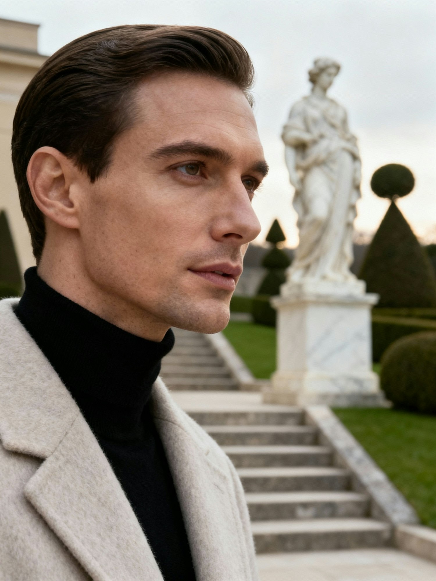 Editorial photoshoot for the brand CELINE, architectural minimalism, quiet and refined elegance. French formal garden with geometric topiaries, marble statues, stone stairs and trimmed grass. Late afternoon, overcast sky, soft and natural lighting only. Neutral tones overall (beige, white, black, grey), no text, no logo, perfectly realistic photo rendering. — Close portrait of a man turned slightly to his right, light hitting one side of his face. He has clean features, short hair neatly combed back. He wears a black turtleneck and light wool coat over it. Realistic facial structure, natural proportions, symmetrical features, detailed eyes and mouth, no distortion, photographic realism, elegant neutral expression, no blur on the face. The background shows soft bokeh of a marble statue.