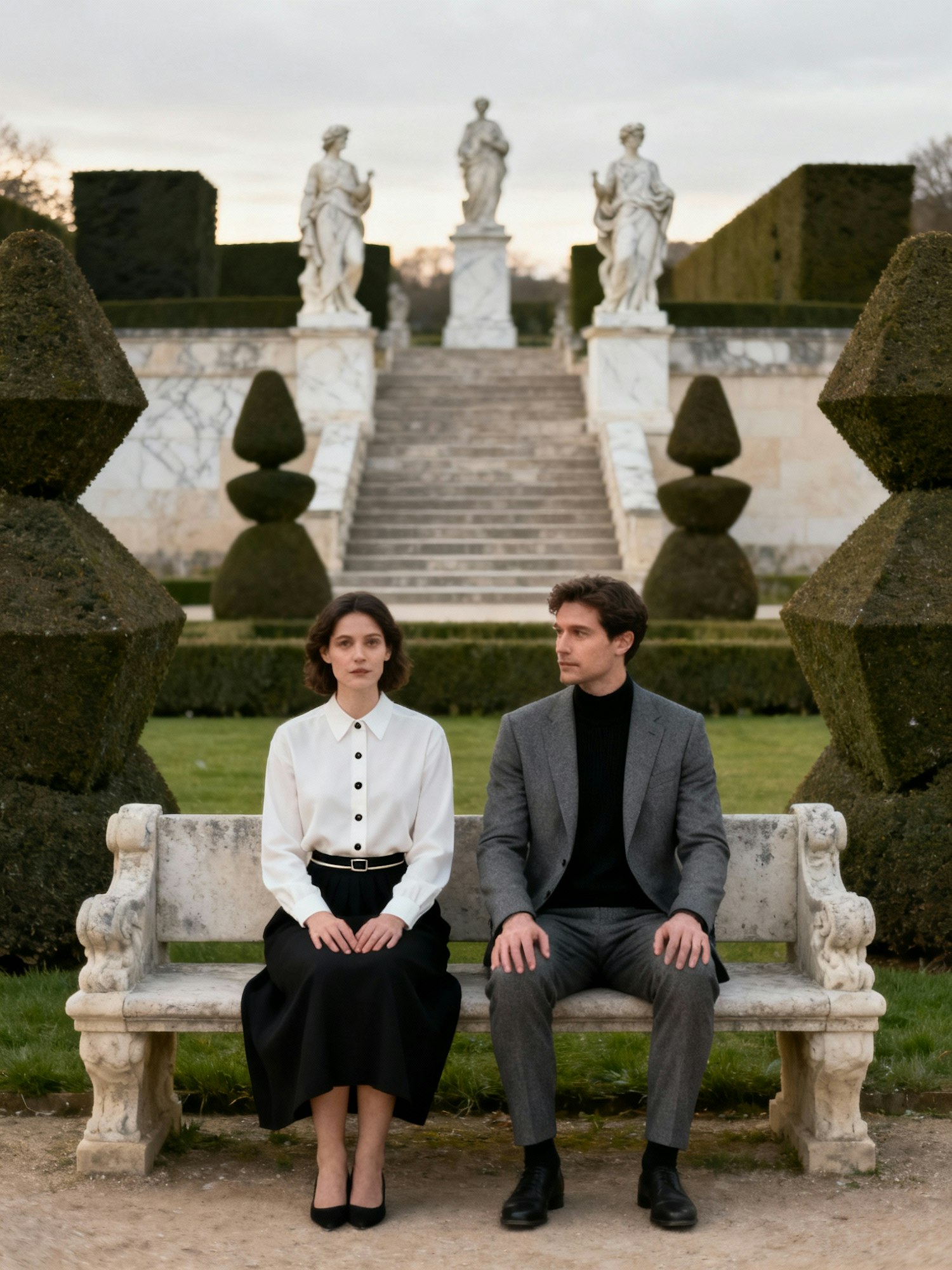 A man and woman sit on a stone bench in a formal garden, surrounded by statues and trimmed hedges, creating a serene and elegant scene.