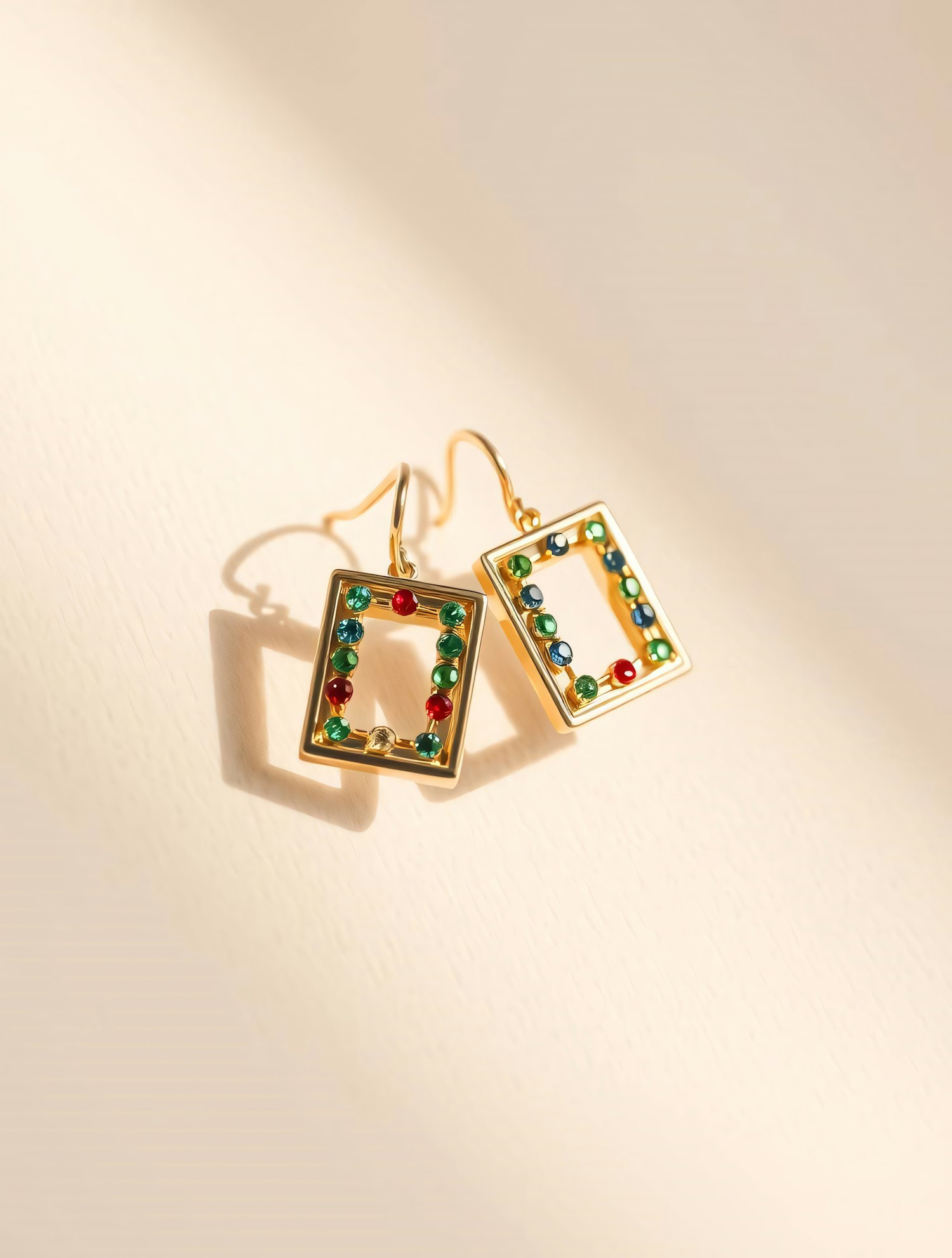 Elegant gold rectangular earrings with colorful gemstones on a light background, showcasing luxury and intricate design.