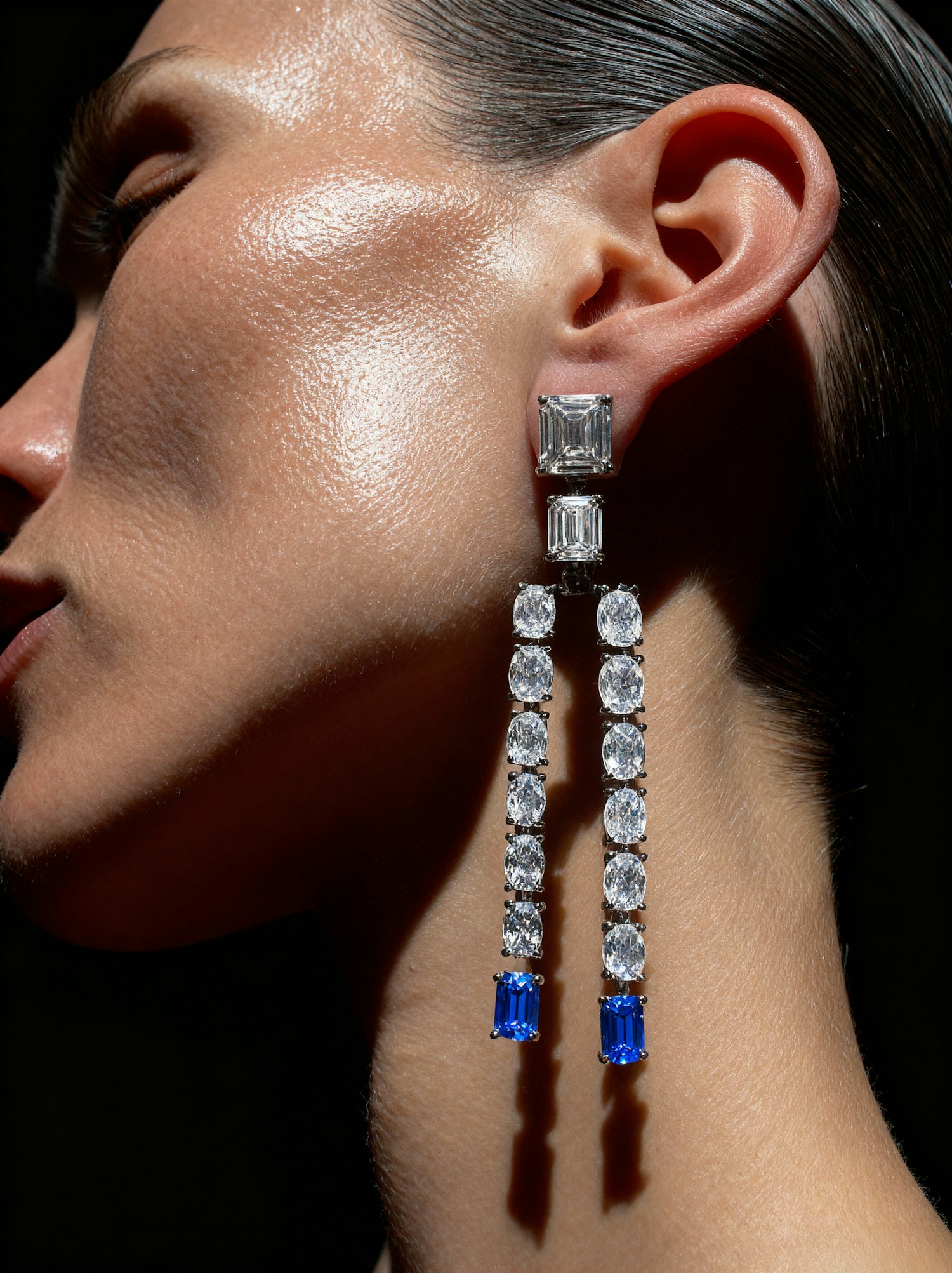 Close-up of a radiant ear wearing long, sparkling earrings with blue gemstones, set against a dark background for contrast.