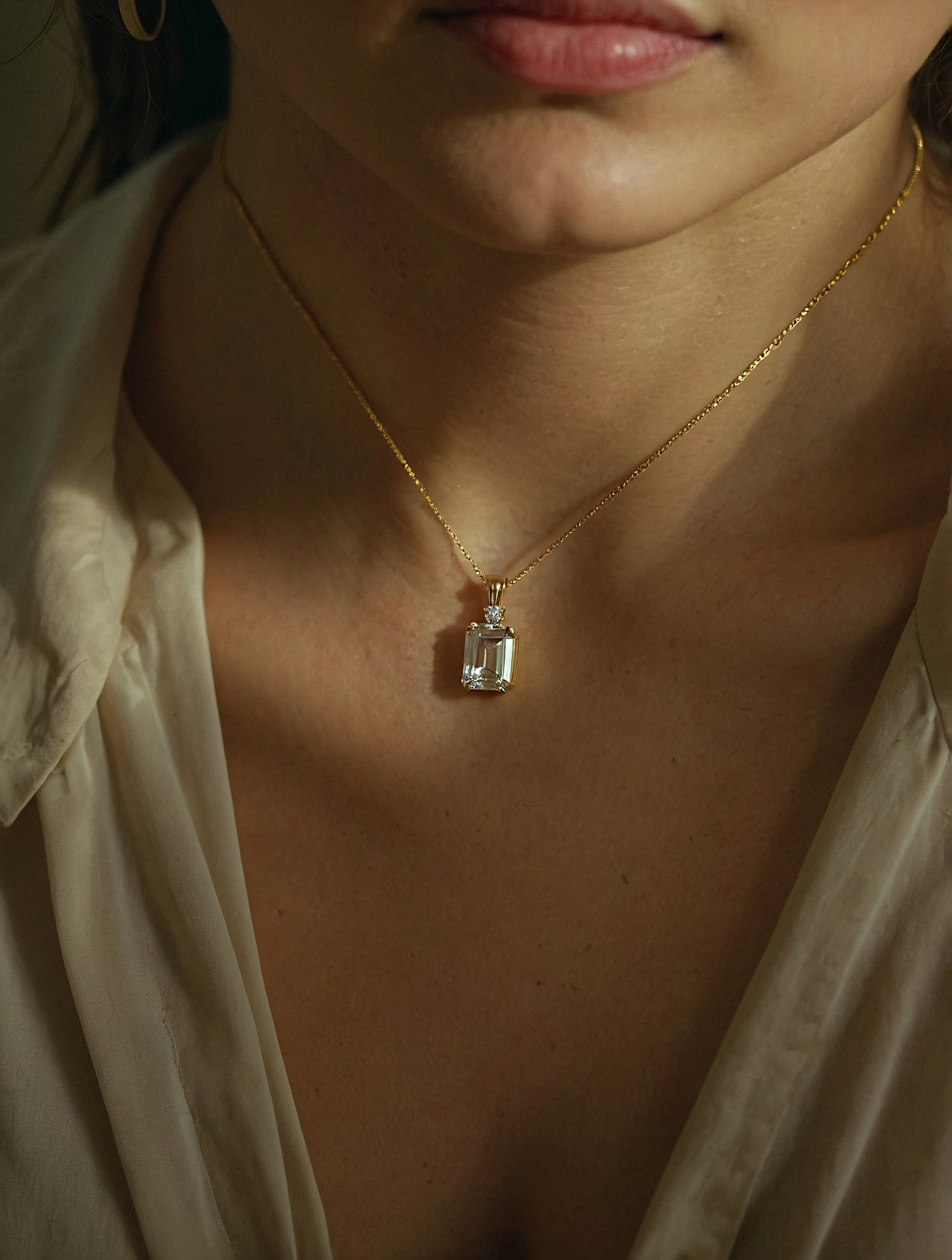 Close-up of a gold necklace with a sparkling emerald-cut gemstone pendant, worn with a cream blouse in warm, soft lighting.