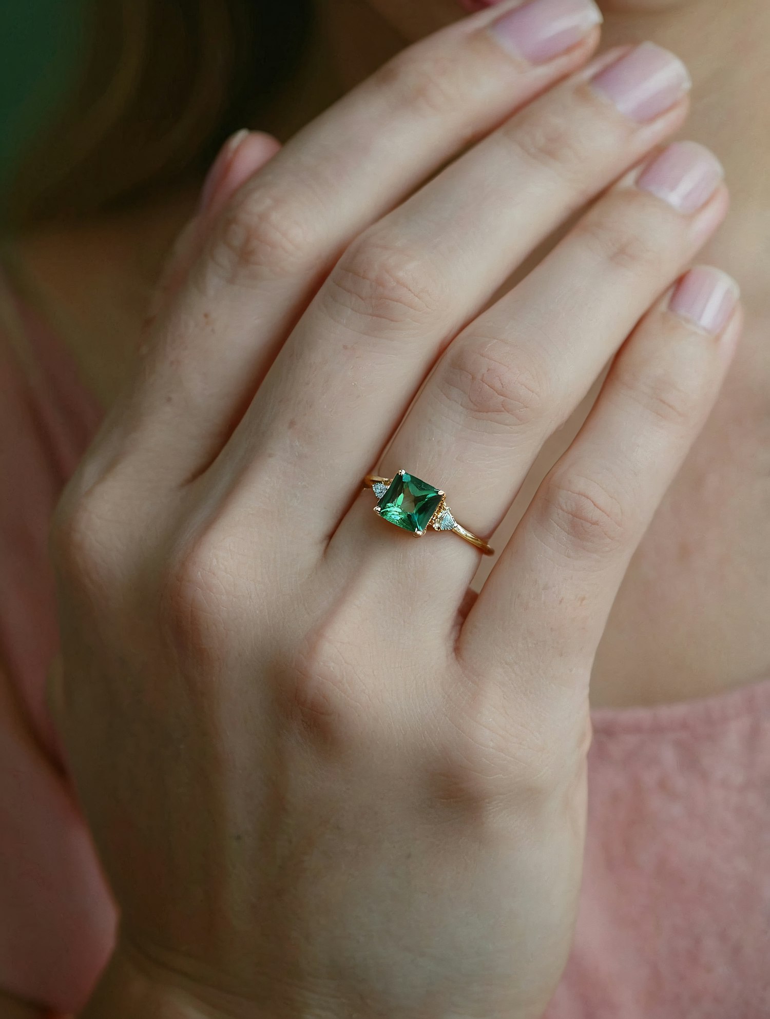 Elegant gold ring with a green gemstone and diamonds on a manicured hand with soft pink nails, set against a blurred background.
