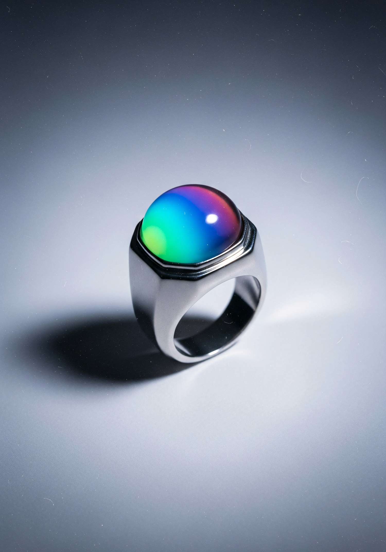 A modern silver ring with a vibrant, multicolored gemstone on a neutral background, showcasing its sleek design and colorful appeal.