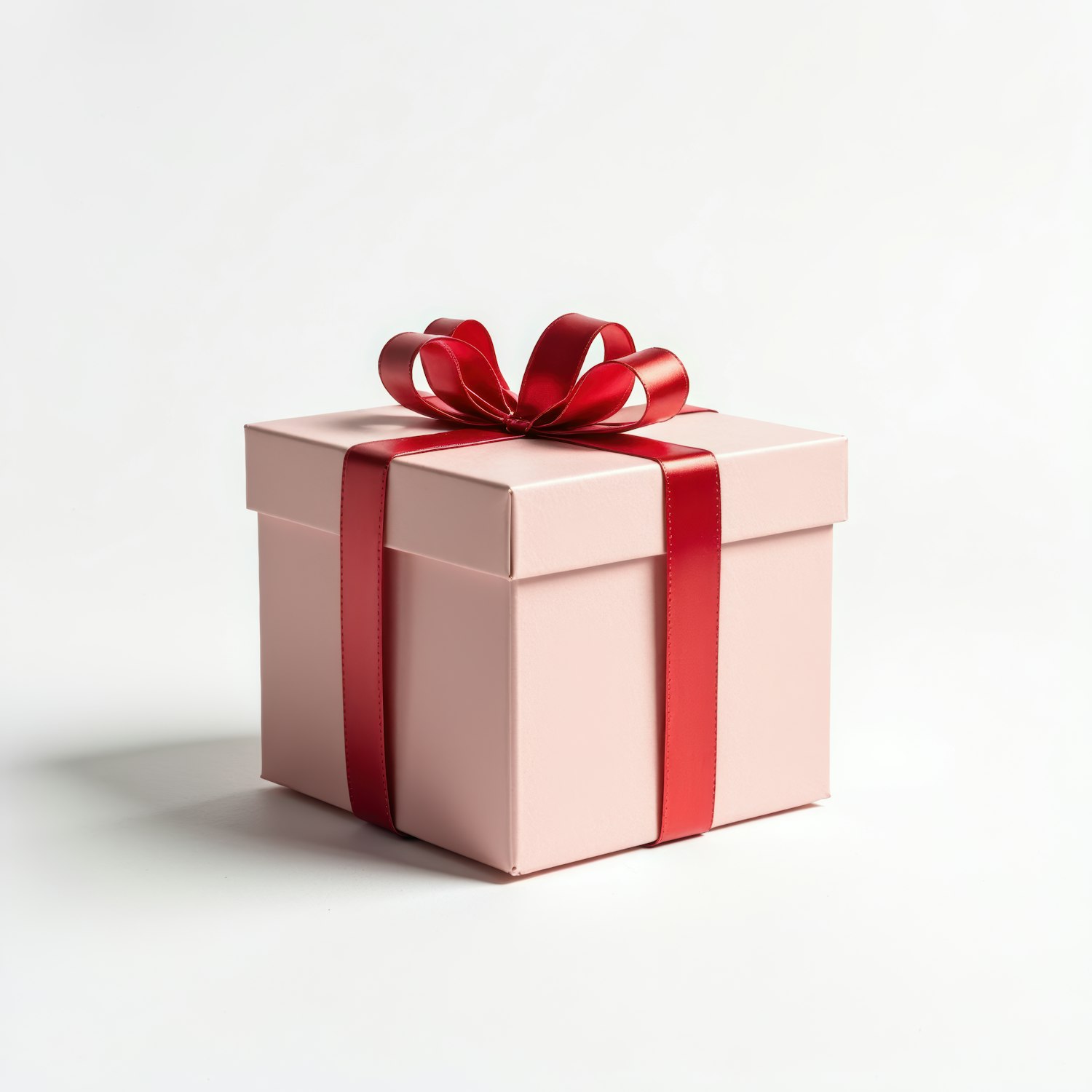 Elegant pink gift box with a red ribbon bow on a white background, perfect for special occasions and celebrations.