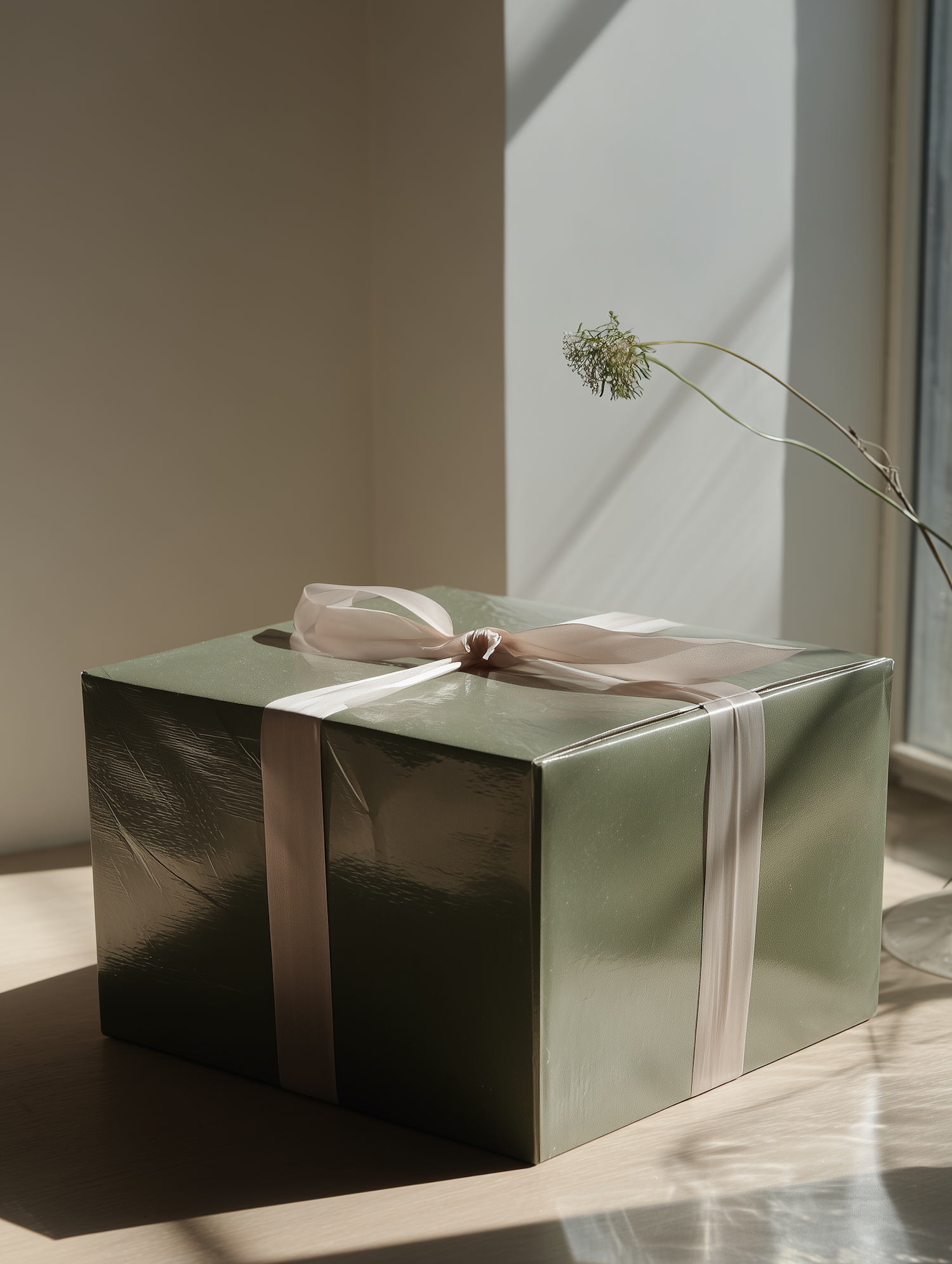 A beautifully wrapped olive-green gift box with a white ribbon, placed on a wooden surface in soft natural light.