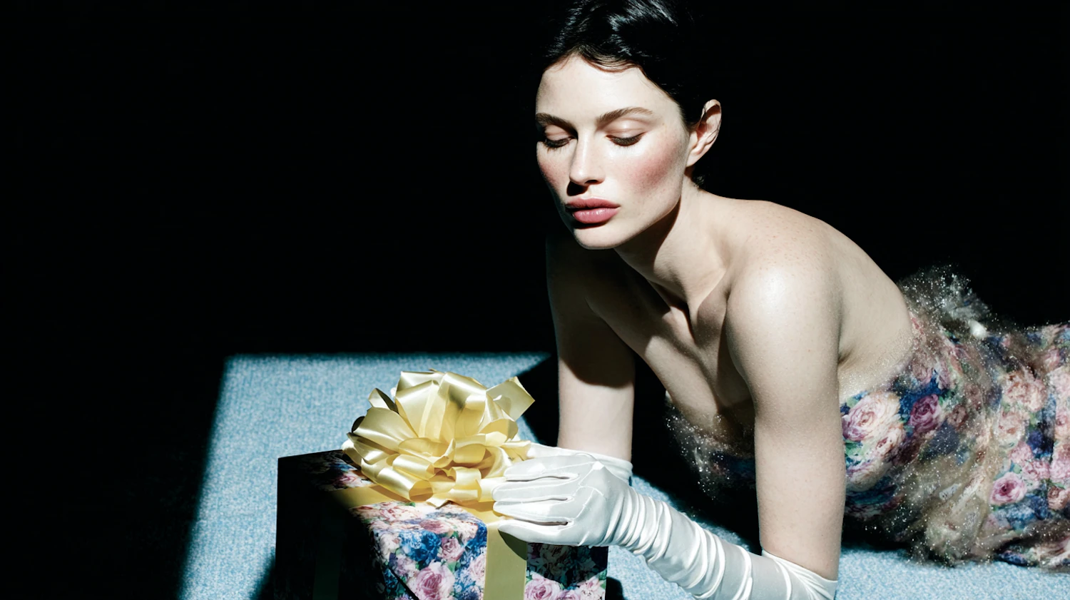 A woman in a floral dress and gloves leans over a gift box with a golden ribbon, set against a dark background.
