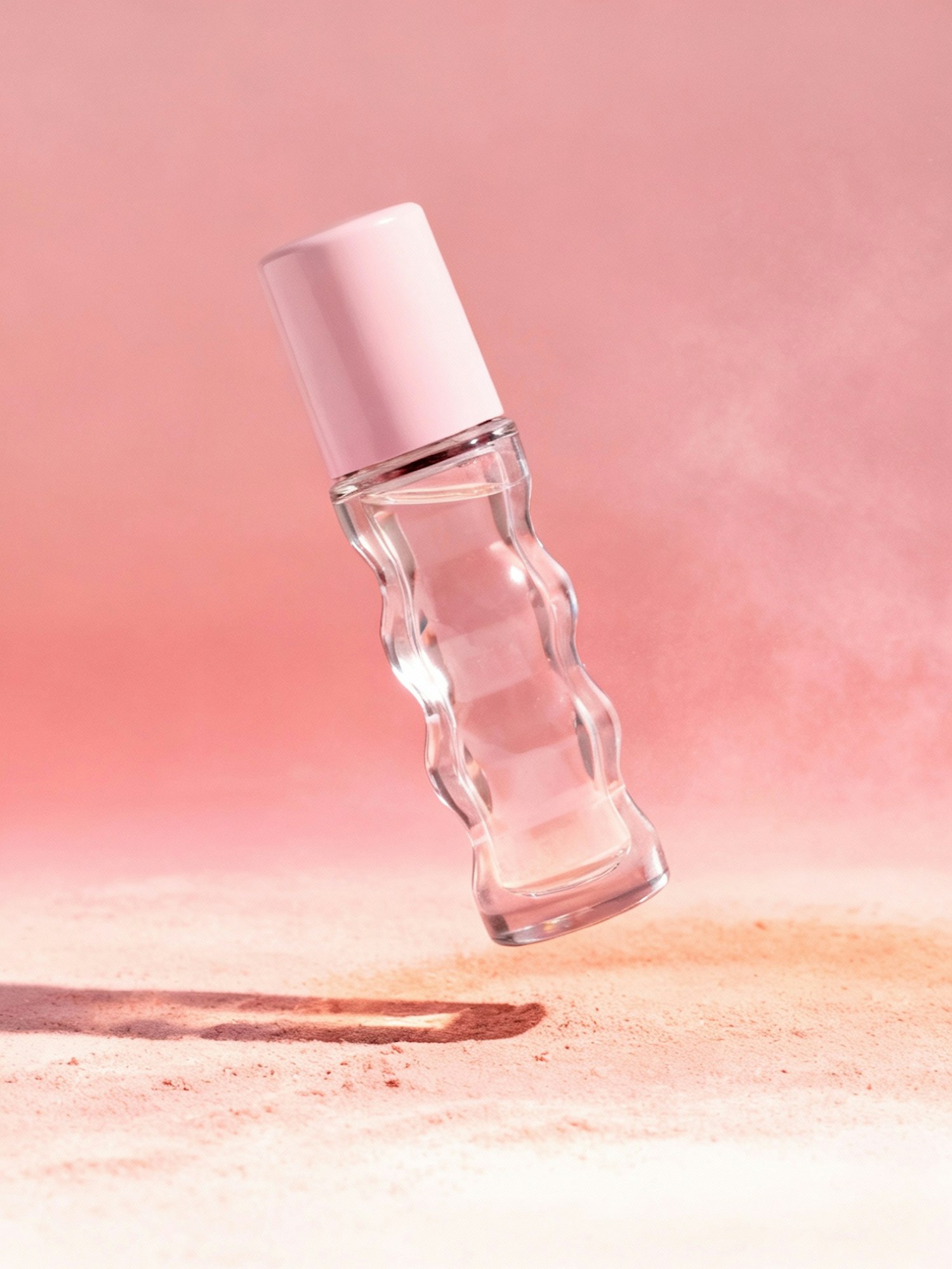 A clear wavy glass bottle with a pink cap floats against a soft pink background, casting a shadow on a textured surface below.