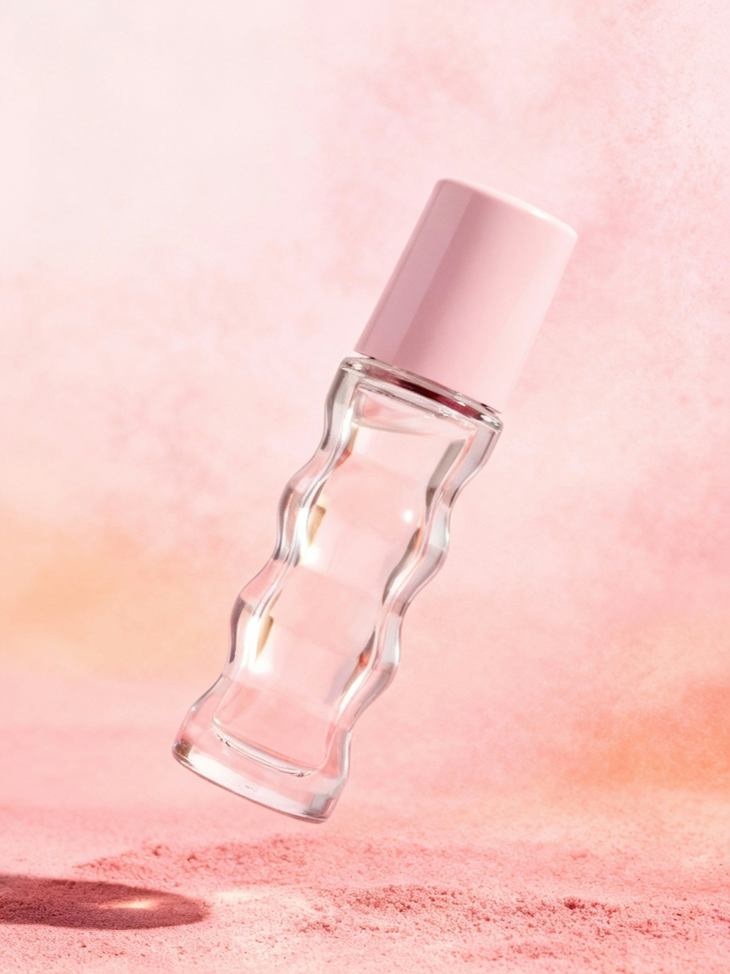 A stylish glass bottle with a pink cap, set against a soft pink and peach background, showcasing modern design and elegance.