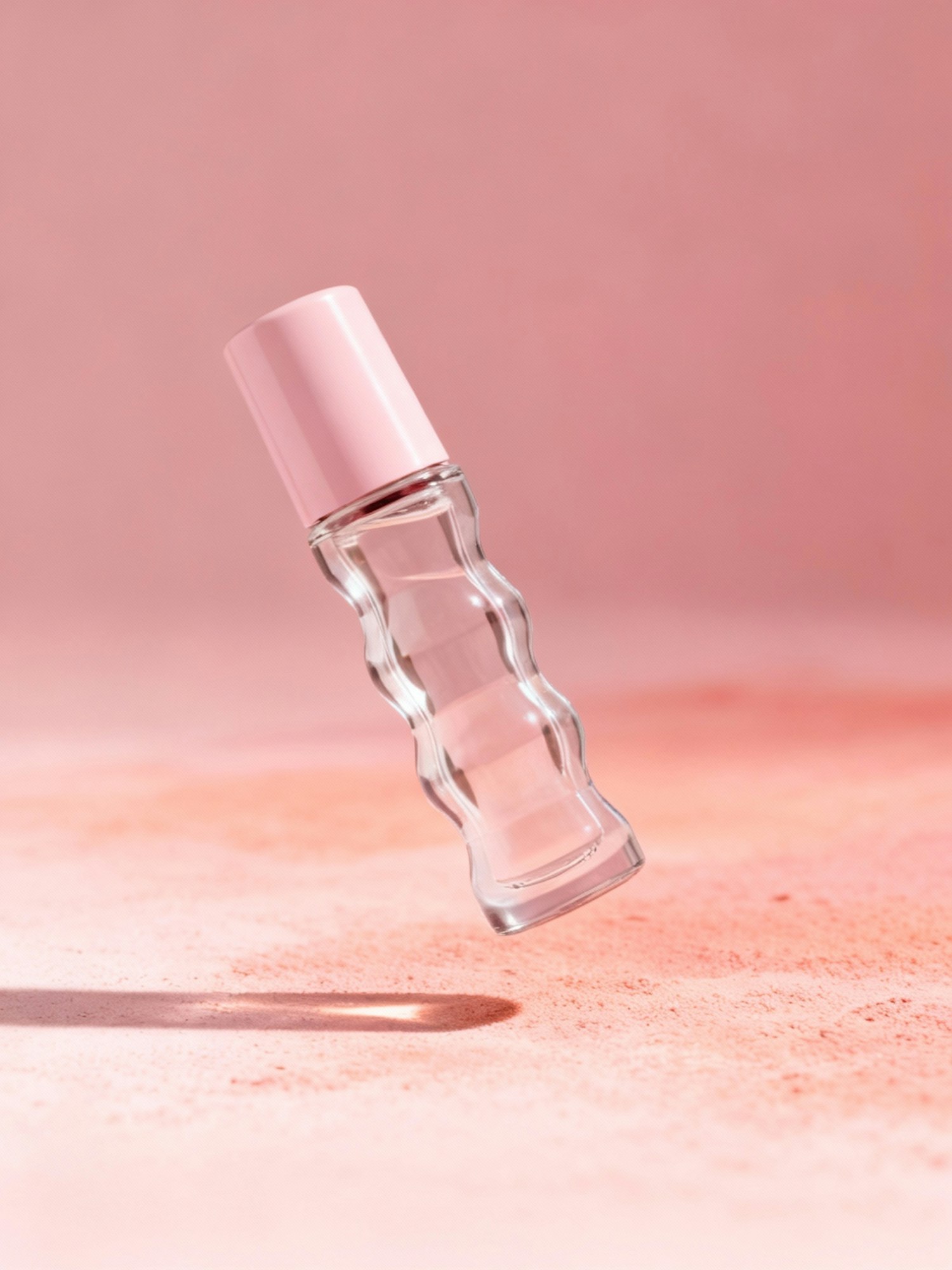 A clear glass bottle with a pink cap floats against a soft pink background, showcasing its elegant wavy design and minimalist aesthetic.