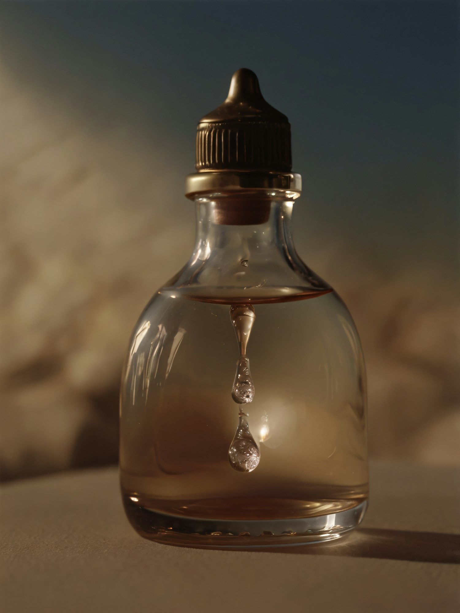 Elegant glass bottle with golden cap and amber liquid, featuring suspended droplets. Warm tones and soft lighting create a serene atmosphere.