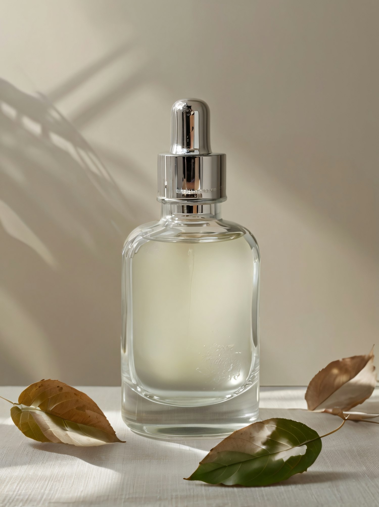 Elegant glass bottle with silver dropper, surrounded by dried leaves on a light surface, creating a minimalist and serene scene.