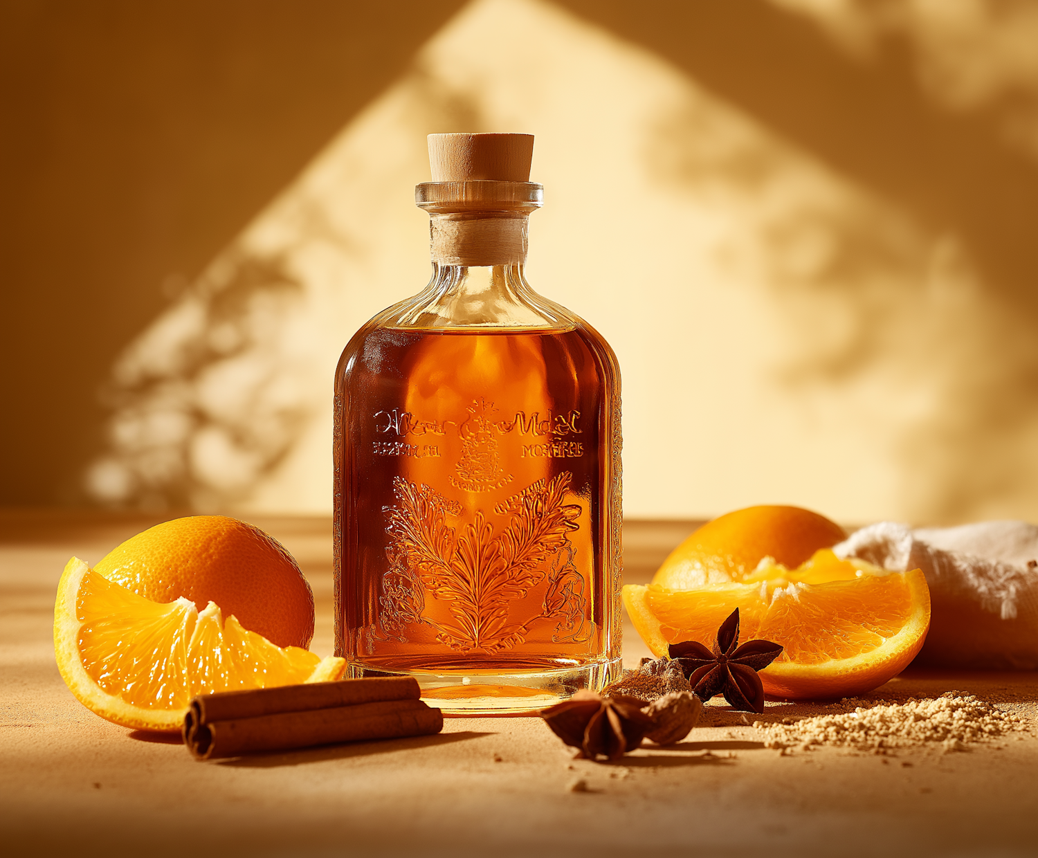 Elegant glass bottle with amber liquid, surrounded by orange slices, cinnamon sticks, and star anise, creating a warm, inviting scene.