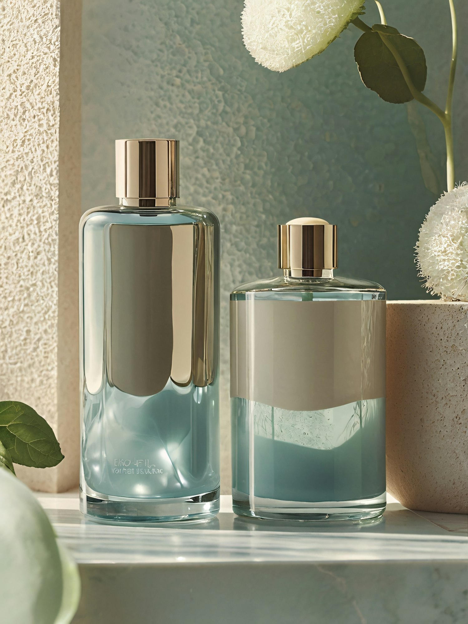 Elegant perfume bottles with gold caps and light blue liquid, set against a textured pastel background with soft lighting.