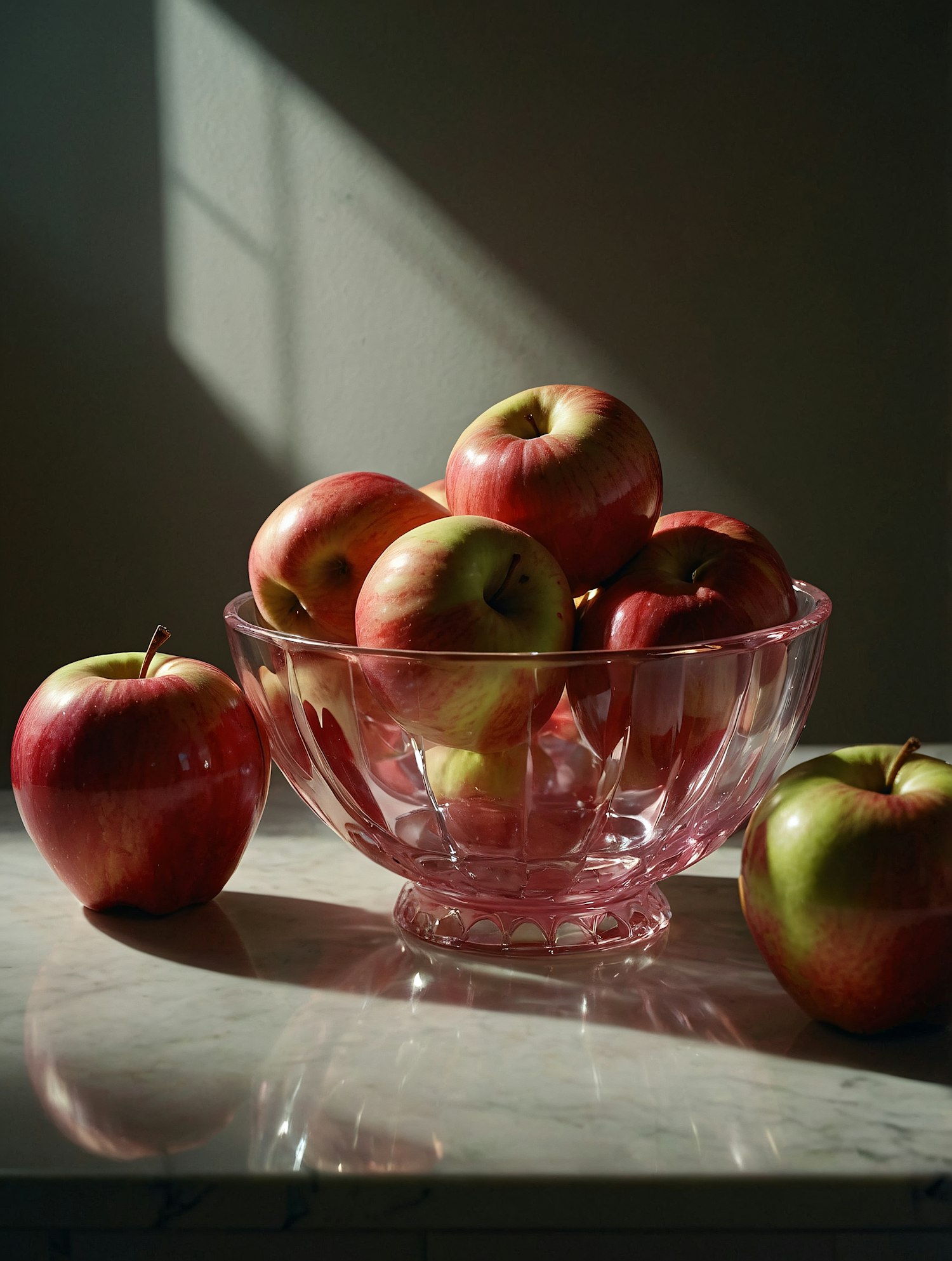 A glass bowl filled with glossy red and green apples on a marble surface, beautifully lit by soft window light.