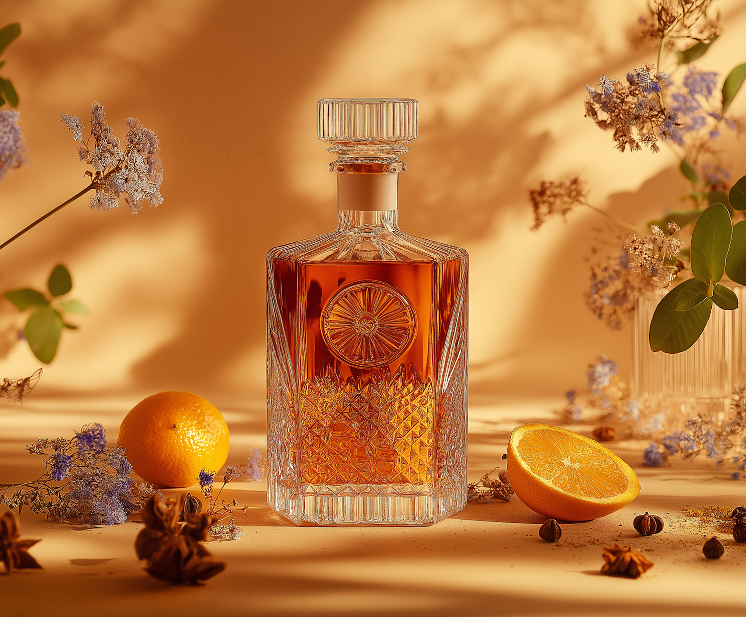 Elegant glass decanter with amber liquid, surrounded by oranges and dried flowers, in warm golden lighting.