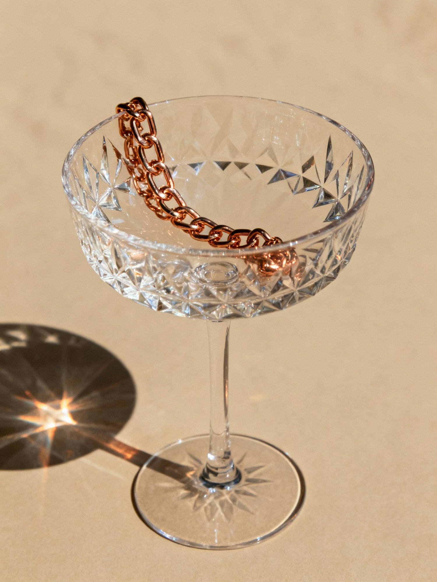 A crystal glass with a rose gold chain draped inside, set on a beige surface with intricate shadows and highlights.