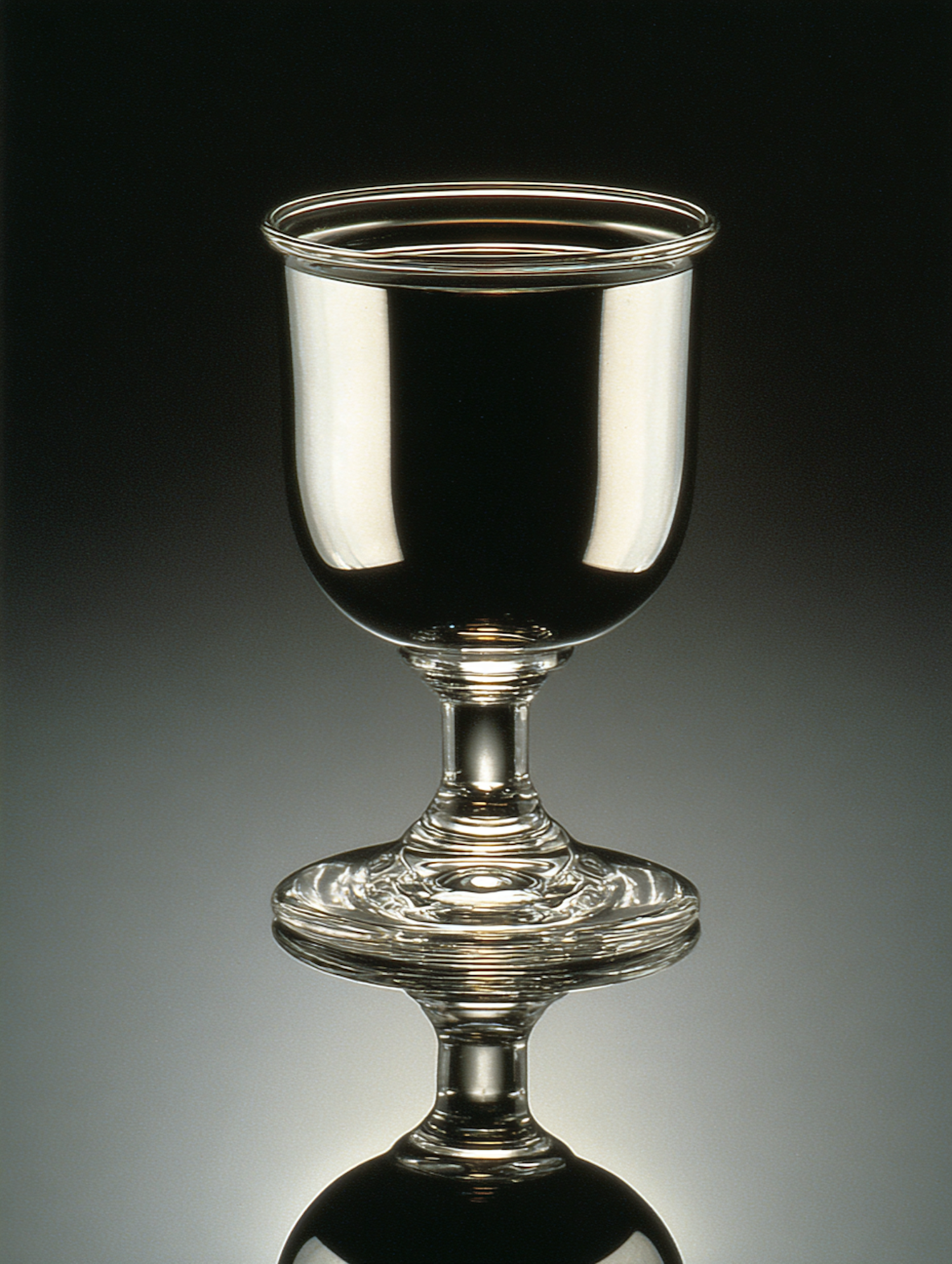 A clear glass goblet with a reflective surface, elegantly displayed against a dark gradient background, showcasing its design and transparency.