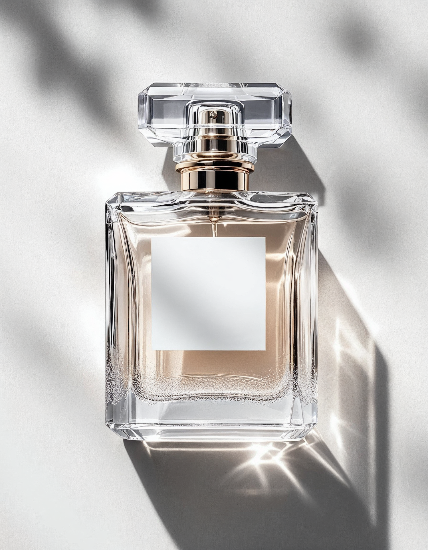 Elegant glass perfume bottle with a diamond-like cap, filled with amber liquid, on a neutral background with soft shadows.