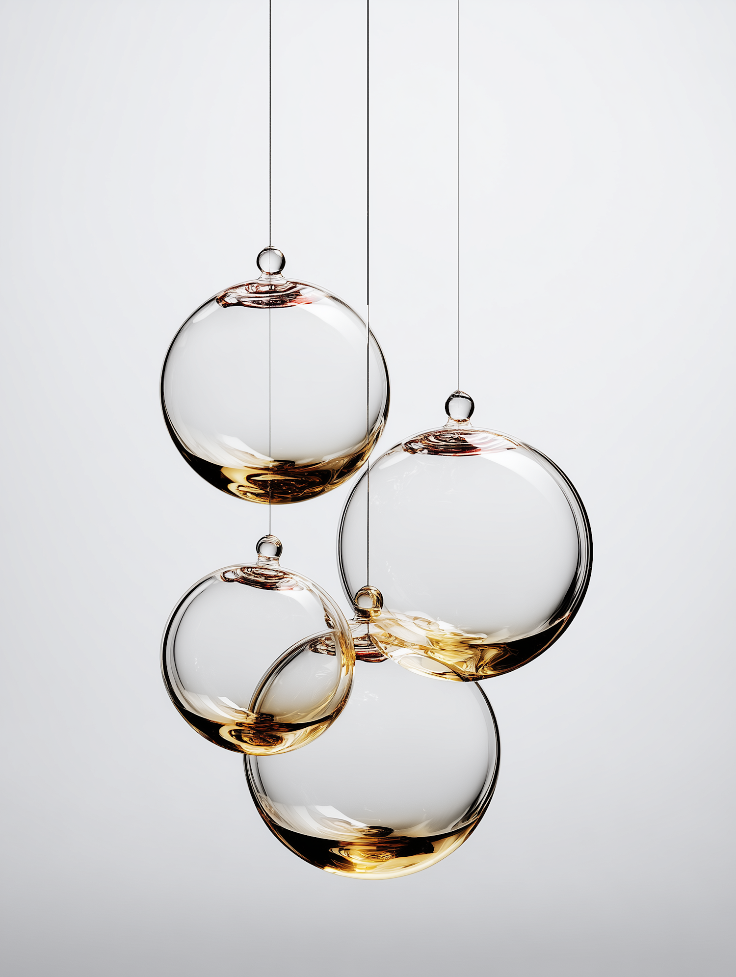 Elegant glass spheres with golden liquid suspended in a minimalist arrangement, showcasing modern design and craftsmanship.