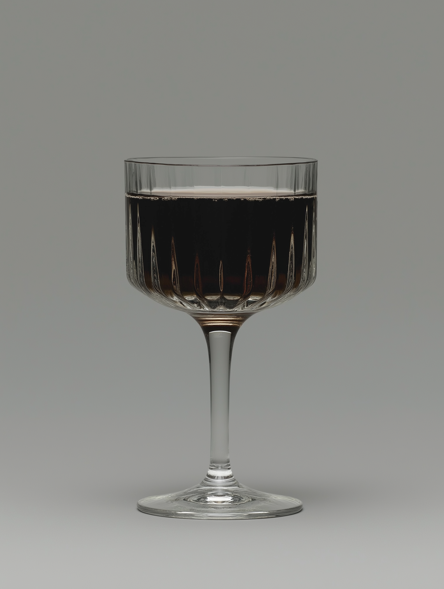 Elegant glass goblet with dark liquid against a neutral gray background, highlighting its textured design and minimalist elegance.