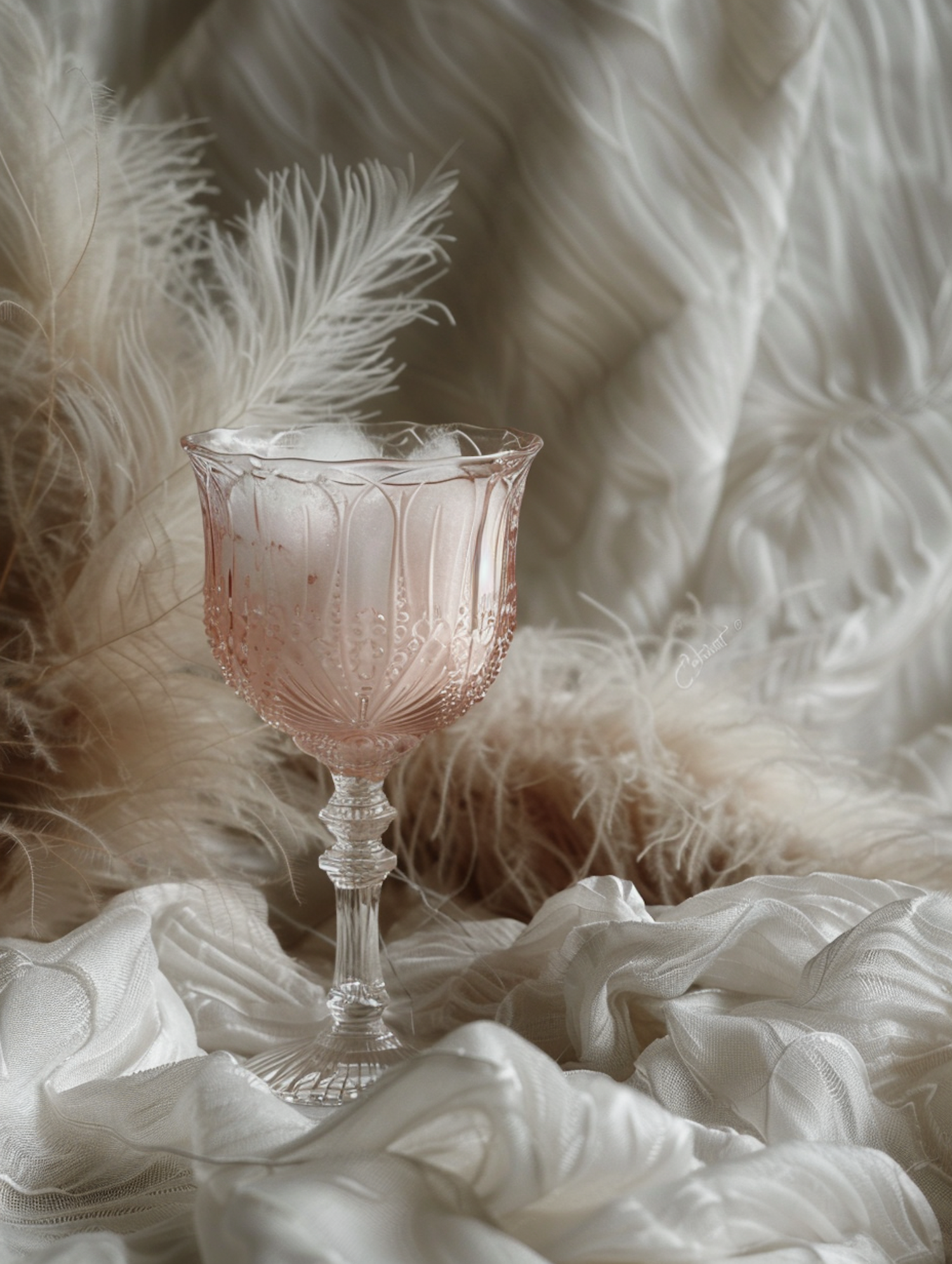 Elegant pink glass goblet surrounded by soft white feathers and luxurious fabric, creating a dreamy, vintage-inspired scene.