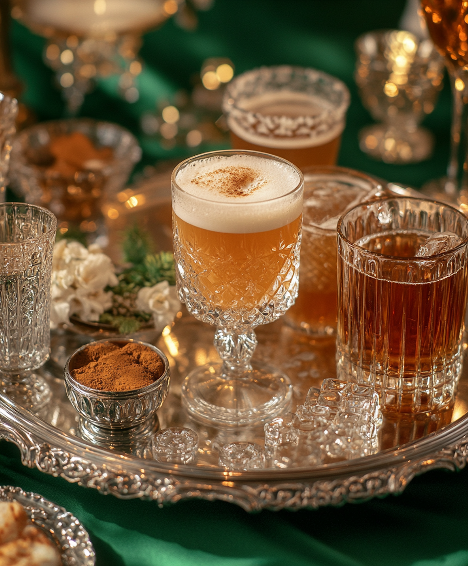 Elegant crystal glassware with frothy drinks and spices on a silver tray, set against a rich green background for a festive ambiance.