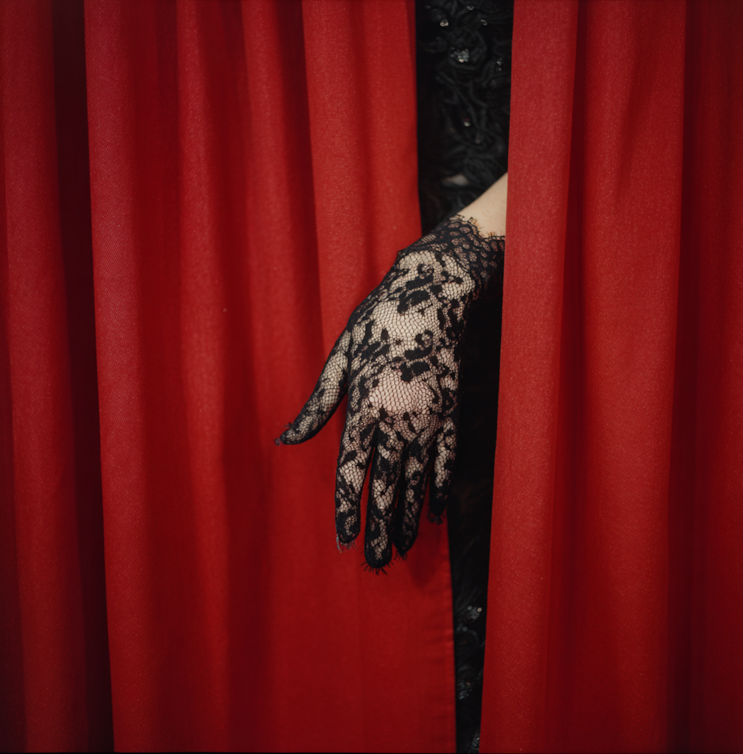 A hand in a black lace glove peeks through vibrant red curtains, creating a dramatic and elegant visual contrast.