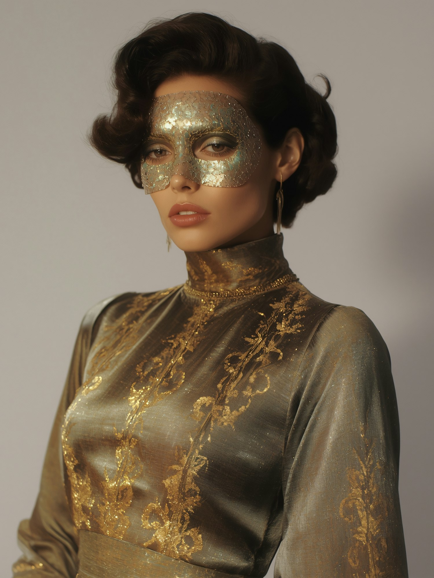 A woman in a gold-patterned dress and shimmering mask exudes elegance and mystery, with soft lighting enhancing her sophisticated look.