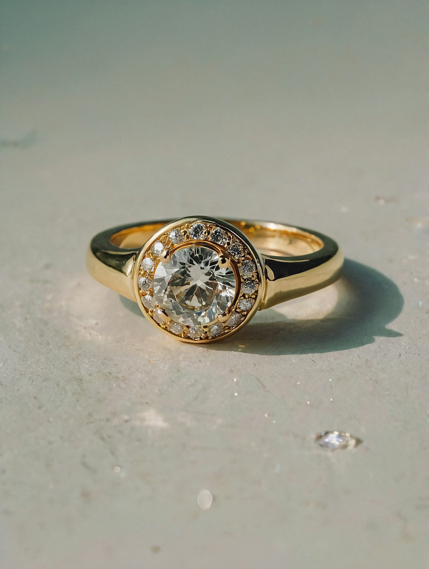 Elegant gold ring with a central diamond and halo of smaller diamonds, showcasing luxury and sophistication on a textured surface.