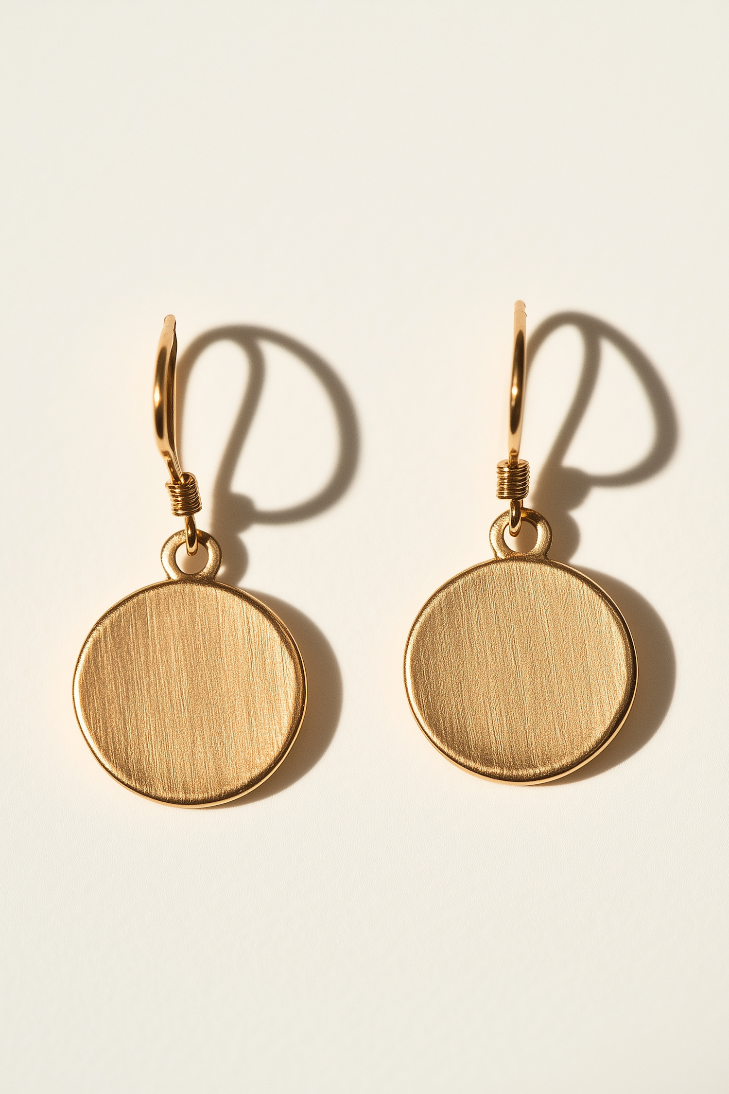 Minimalist gold earrings with brushed circular pendants and simple hooks, perfect for a chic and versatile accessory.